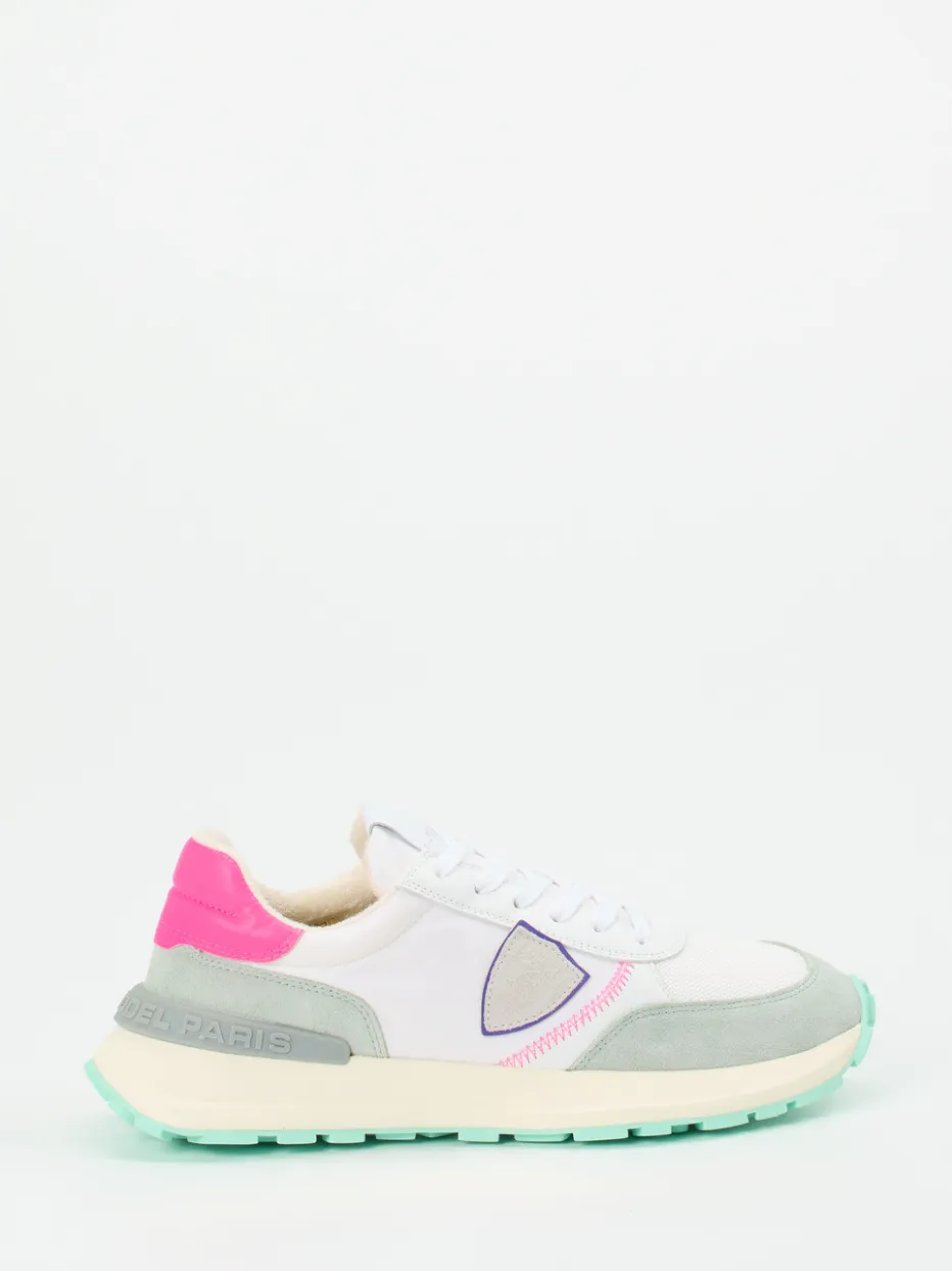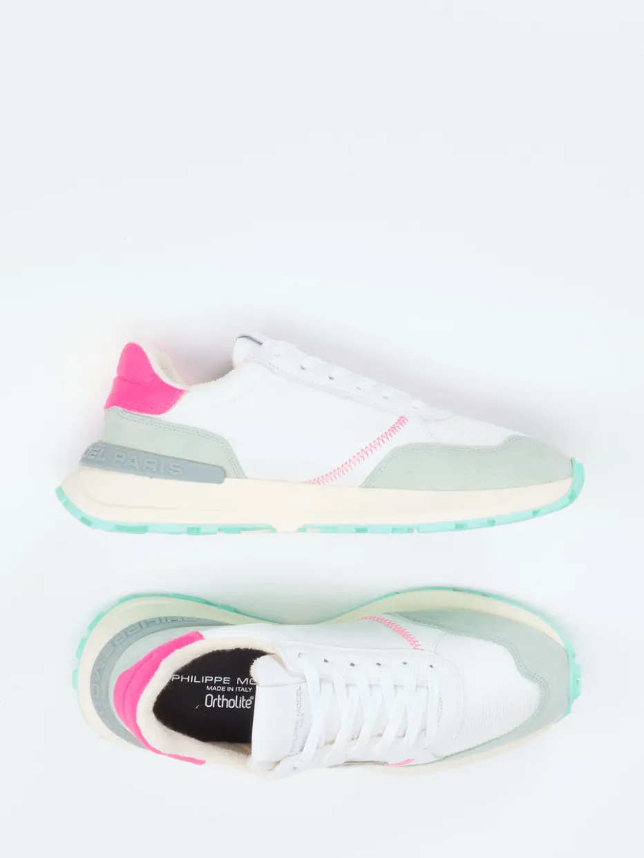 Statement für urbane Frische.Philippe Model interpretiert den Low-Top Sneaker neu: sportlich, retro und farbstark. Ideal für Tage, die Dynamik und Stil verlangen: Das Modell kombiniert weißes Mesh mit salbeifarbenem Veloursleder – samtig und angenehm leicht. Knallige Highlights in Pink und Mint bringen den Pastelltrend der Saison auf den Punkt. Die klassische Silhouette mit geformter Sohle, gepolstertem Ortholite-Fußbett und markentypischem Seitenpatch rundet das Gesamtbild ab. Harmoniert insbesondere mit hellen, sportiven Looks oder Streetwear in Tonalität. Mit Komfort und Design überzeugt dieser Sneaker auf ganzer Linie – Philippe Model setzt das modische Statement dazu.