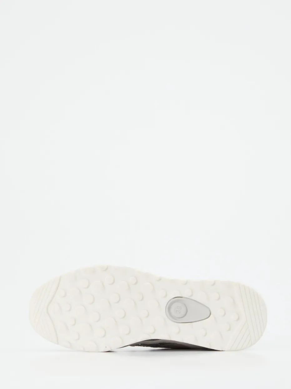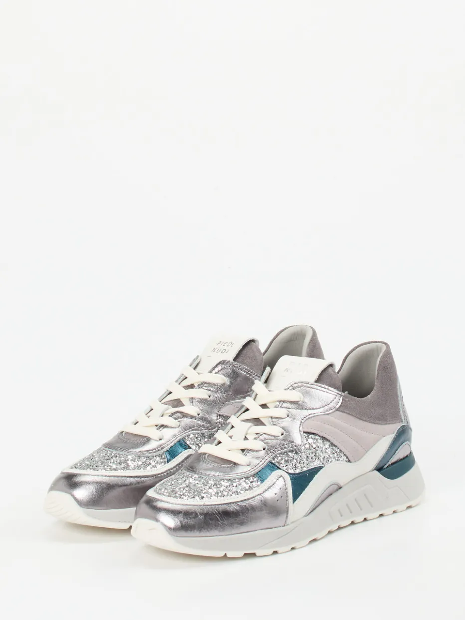 Statement mit Stil und Glanz.Piedi Nudi präsentiert einen Chunky Sneaker für Damen im topaktuellen Metallic-Look. Wenn ein sportlicher Auftritt mit urbaner Extravaganz gefragt ist, liefert dieses Modell die perfekte Antwort. Das hochwertige Metallicleder wird durch samtiges Veloursleder und Glitzertextil ergänzt und ergibt zusammen mit Mesh-Partien eine spannende Materialkomposition. Akzente in Silber, Hellgrau und Petrol unterstreichen die markante chunky Retro-Silhouette. Schnürung, gepolsterte Zunge und eine rutschfeste Gummisohle sorgen für Funktionalität im Alltag. Der Sneaker passt hervorragend zu Streetwear-Looks oder Y2K-inspirierten Outfits. Trendiger Look und bequeme Passform in bewährter Piedi Nudi Qualität.