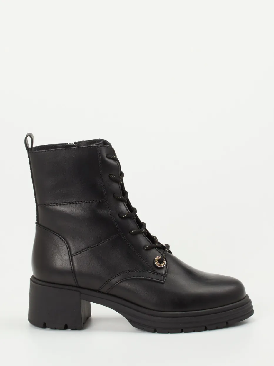 Ob für den Stadtbummel oder abends im Lieblingscafé – die Kombination aus goldfarbenen Metallösen, dezent glänzenden Schnürsenkeln und markanter Profilsohle macht dieses Design zum stilvollen Alltagsbegleiter. Glatt verarbeitetes Kalbleder mit matter Oberfläche verleiht der knöchelhohen Silhouette eine klare Linienführung, der 4 cm hohe Blockabsatz bringt komfortable Höhe. Funktionale Akzente wie der seitliche Reißverschluss und eine praktische Zuglasche runden den Look ab. Perfekt zu Cropped Jeans oder Strickkleidern.