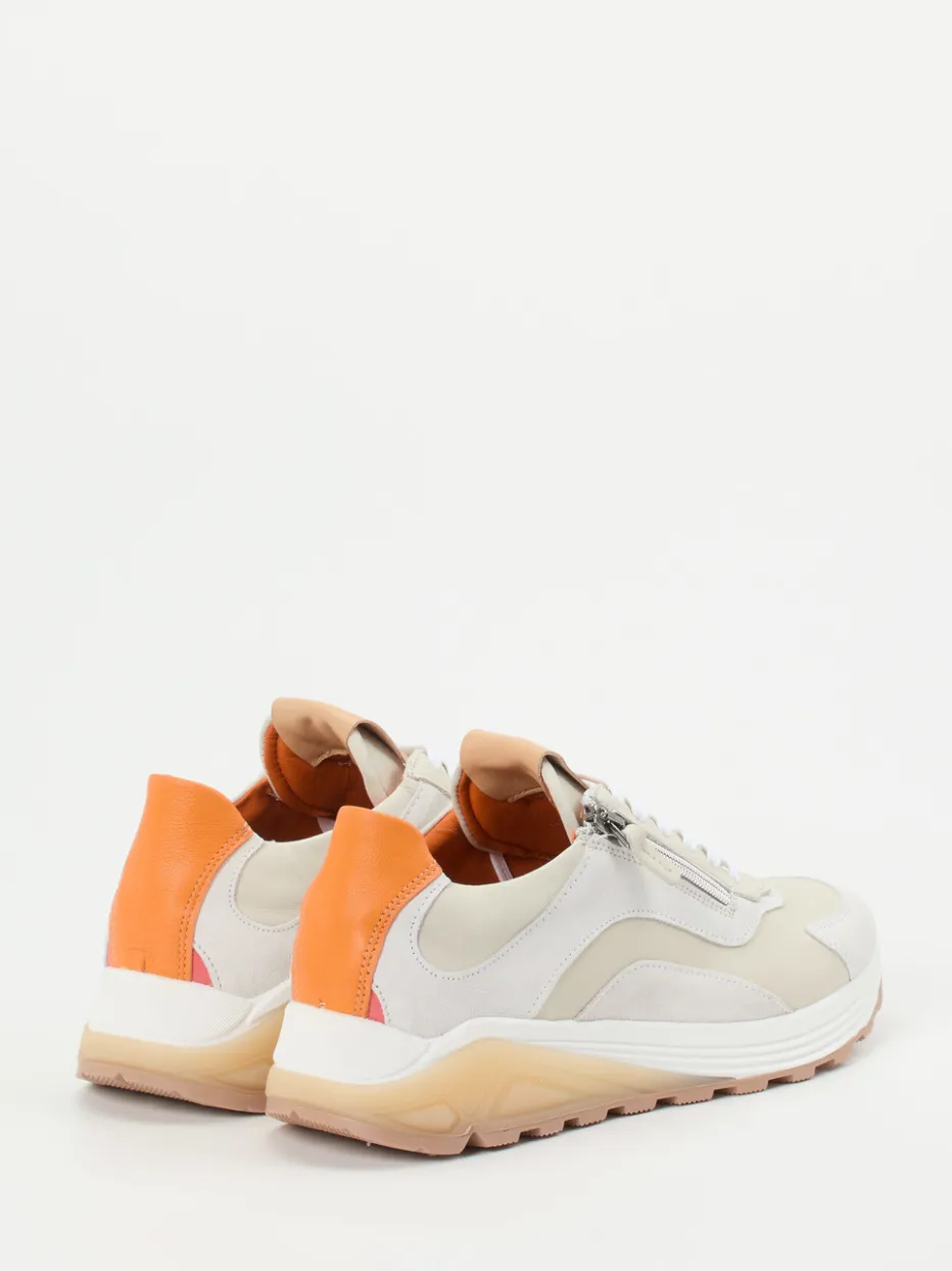 Kontraststark und komfortbetont.Piedi Nudi präsentiert mit diesem Damen-Sneaker ein sportliches Modell für Alltag und Reisen. Die Kombination aus offwhitefarbenem Veloursleder und glattem Kalbleder in Grau und Orange verleiht dem Design eine moderne Dynamik. Seine sportlich-voluminöse Form wird durch eine gepolsterte Ferse und eine markant mehrfarbige Gummisohle ergänzt. Dank seitlichem Reißverschluss lässt sich der Schuh komfortabel anziehen. Orange Akzente und der Retro-Runner-Charakter machen ihn saisonal zum Highlight und unterstreichen aktuelle Streetwear-Tendenzen. Piedi Nudi steht für tragbaren Komfort im trendnahen Look.