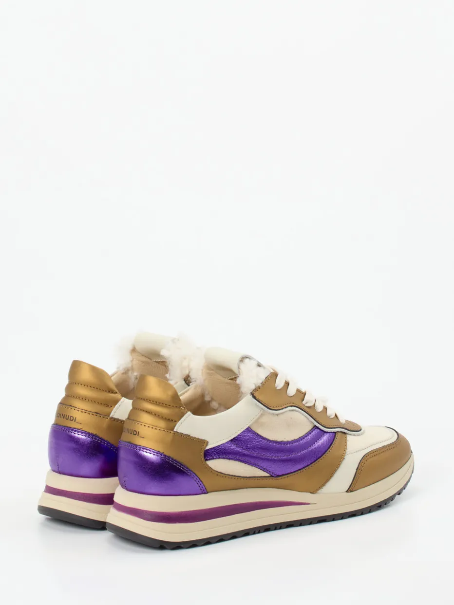 Stylische Akzente für kühle Tage.Piedi Nudi beweist mit diesem Damen-Sneaker, wie modisch Funktionalität sein kann. Für entspannte Stadtspaziergänge oder das Wochenende im Grünen bietet das Modell mit seiner sportlich-klassischen Form und warmem Teddyplüsch-Futter angenehmen Tragekomfort. Das Obermaterial aus hochwertigem Kalbleder zeigt sich in Beige, kombiniert mit glänzenden Metallic-Elementen in Violett und Gold. Kontrastreiche Details wie ein violetter Streifen auf der profilierten Gummisohle und ein gepolsterter Schaftrand unterstreichen den angesagten Retro-Look. Streetwear-Einflüsse und Color-Blocking machen den Sneaker zum Eyecatcher. Lässt sich perfekt mit Wollmantel oder Winterparka kombinieren. Ein markentypischer Mix aus Komfort, Qualität und Trendbewusstsein.