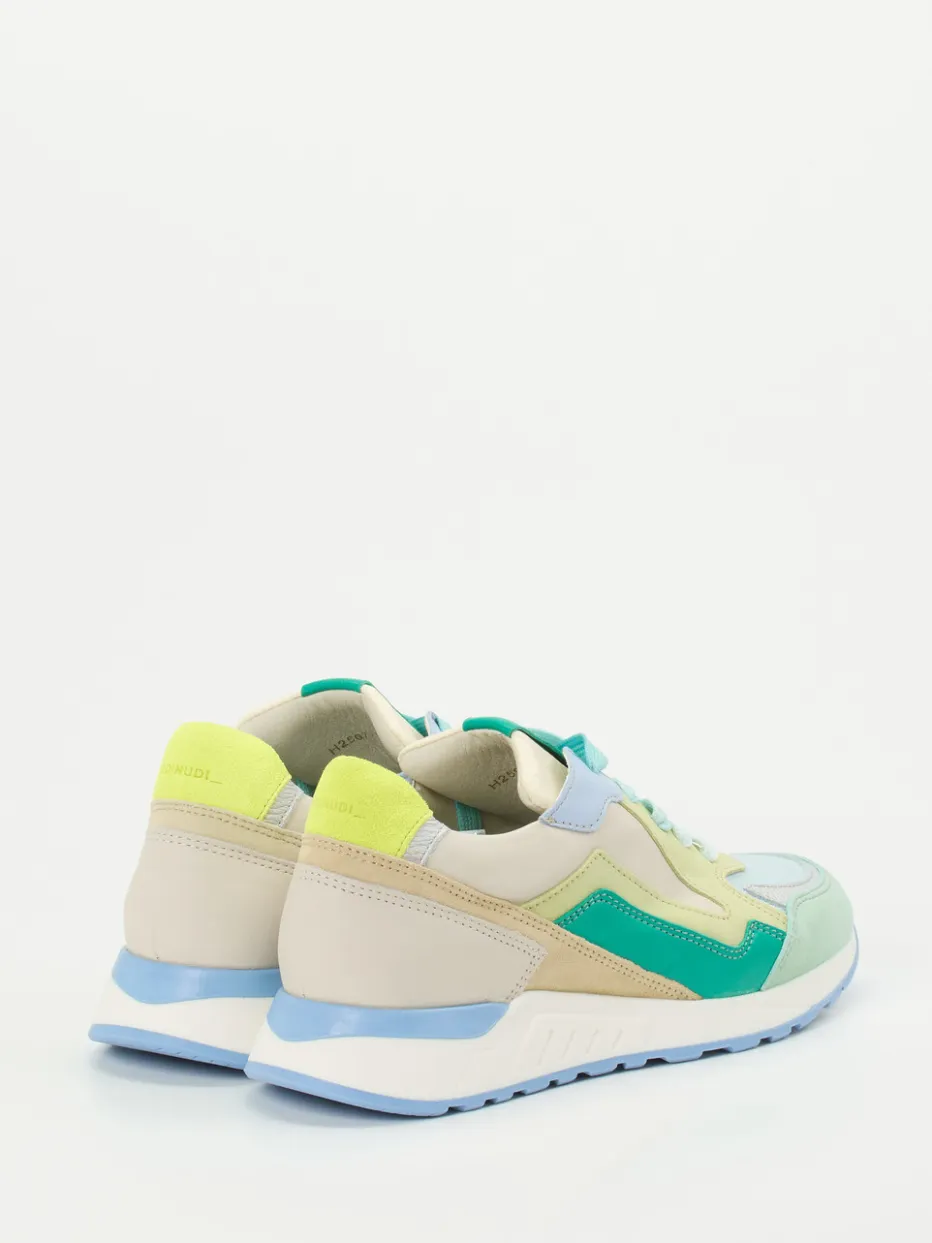Retro-Look in Pastell für entspannte Sommertage.Piedi Nudi präsentiert einen leger-eleganten Damen-Sneaker im Retro-Runner-Stil. Ideal für Stadtspaziergänge oder Urlaubstage bietet das Modell durch sein ergonomisches Design hohen Tragekomfort. Das Obermaterial besteht aus weichem Kalbleder, ergänzt durch samtig angeschliffenes Veloursleder und Mesh für luftige Leichtigkeit. Der sportliche Schnitt, die tonal abgestimmten Nähte und das Logo auf der Zunge unterstreichen den trendigen Color-Blocking-Look in Pastellblau, Mintgrün und Gelb. Eine profilierte Gummisohle sorgt für Trittsicherheit; die gepolsterte Zunge und verstärkte Ferse runden die Funktionalität ab. Perfekt zu leichten Jogpants oder pastelligen Crossbody-Bags. Piedi Nudi steht für stilvollen Komfort mit hochwertiger Verarbeitung.