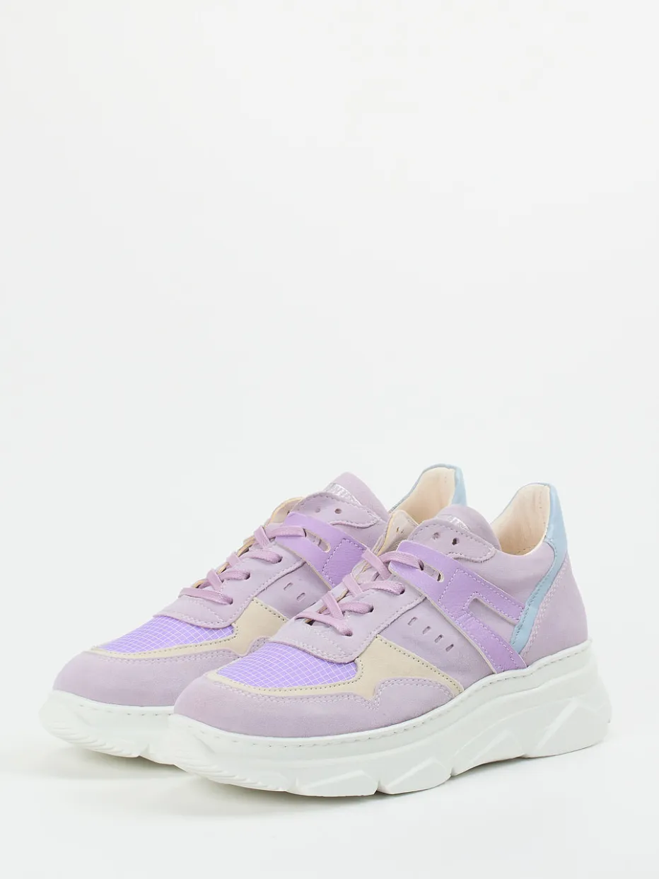 Streetstyle trifft Komfort.Der Piedi Nudi Sneaker für Damen vereint modische Raffinesse mit sportlichem Tragekomfort. In sommerlichen Alltagssituationen überzeugt er mit einem hochwertigen Materialmix aus samtig angeschliffenem Veloursleder in Flieder, Mesh-Einsätzen und einem soften Lederfutter. Die voluminöse Silhouette mit farblich abgesetzten Overlays und silberfarbenem Logoprint steht ganz im Zeichen des Chunky-Trends. Eine rutschhemmende Gummisohle bietet Halt, während das herausnehmbare Fußbett für individuelle Anpassung sorgt. Inspiriert vom aktuellen Y2K-Revival, harmoniert das Design perfekt mit Oversized-Shirts und pastellfarbenen Crossbody-Bags. Ein femininer Statement-Sneaker mit hohem Style- und Wohlfühlfaktor.