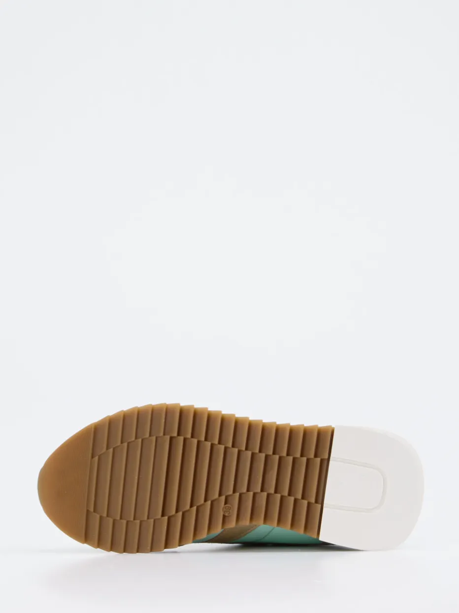Ideal für entspannte Alltagstage oder die nächste Urlaubsreise bietet dieser Schuh Tragekomfort in H-Weite, ergänzt durch ein wechselbares Softfußbett. Die Kombination aus Veloursleder und Textil verleiht dem Modell eine matte, zugleich strukturierte Oberfläche. Pastellfarbenes Mintgrün dominiert das Design, akzentuiert durch goldmetallische Highlights und eine beigefarbene Keilsohle mit markantem Profil. Seine klassische Runner-Silhouette mit Schnürverschluss spiegelt angesagte Streetwear-Ästhetik wider. Metallic-Akzente und Logo-Details sorgen für einen trendbewussten Auftritt, besonders reizvoll zu verkürzten Hosen oder fließenden Röcken.