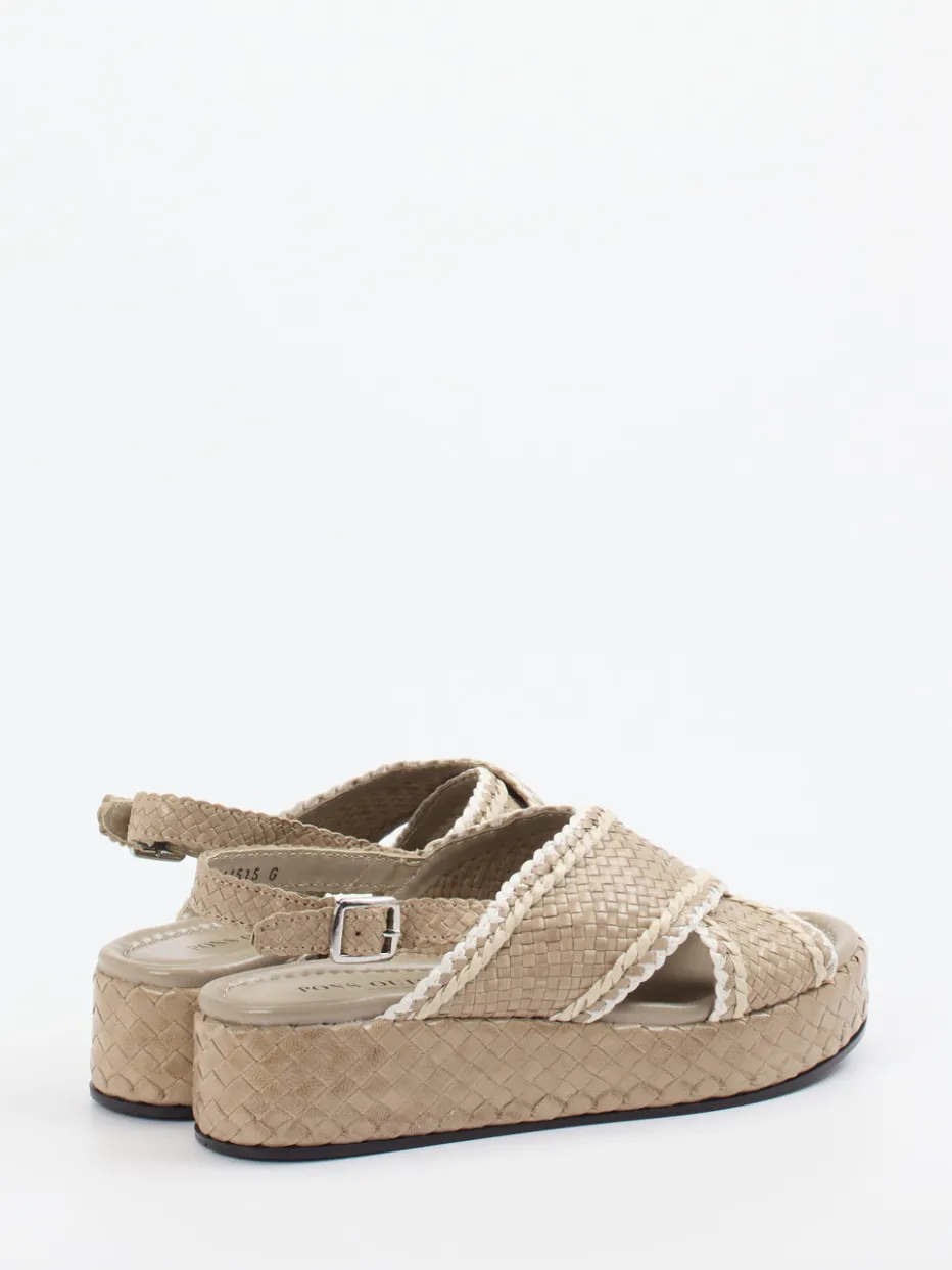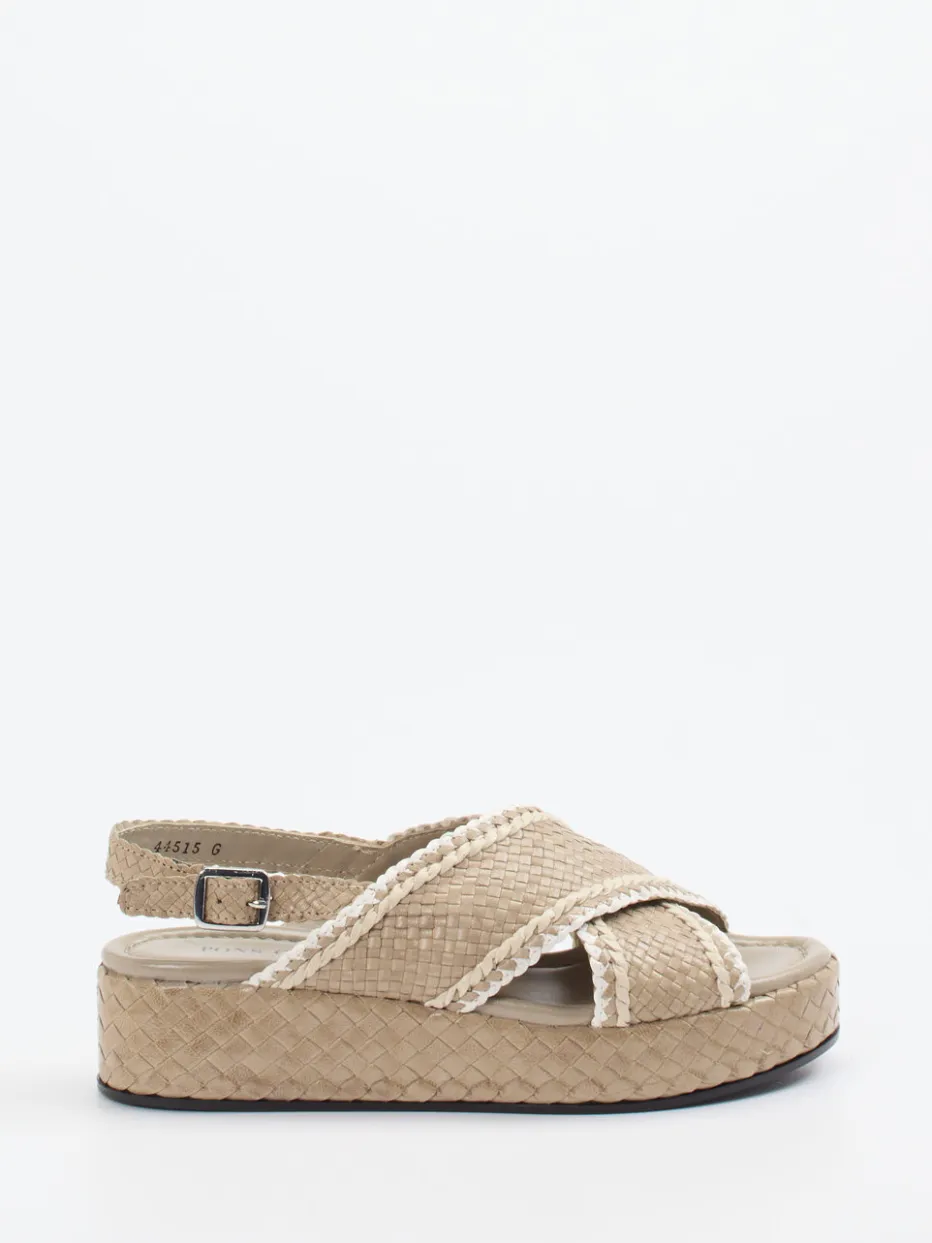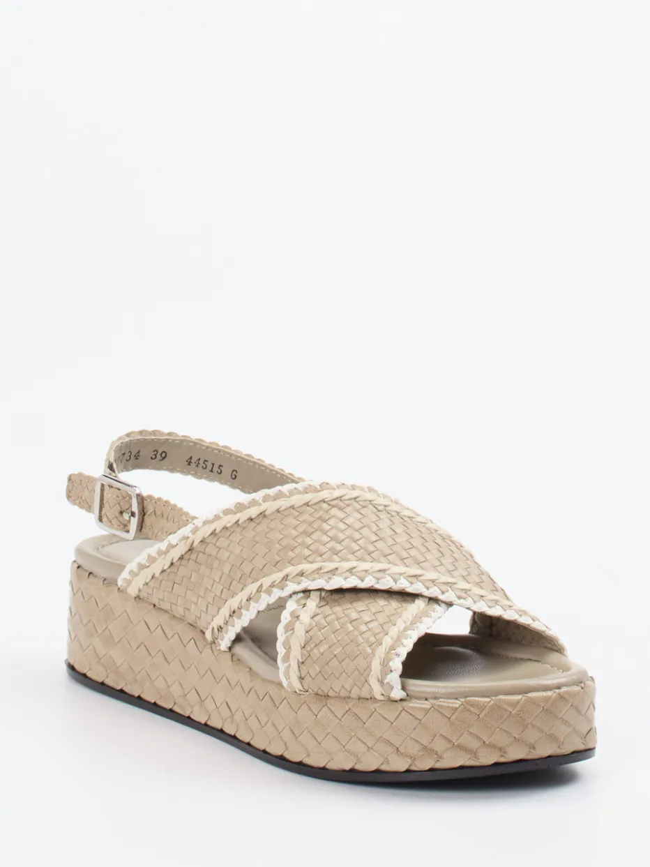 Ideal für Urlaubsflair und entspannte Alltagssituationen verbindet dieses Modell beiges Flechtleder mit einer markanten, weißen Kontrastpaspelierung. Die gekreuzten, matt strukturierten Riemen und der individuell verstellbare Fersenriemen mit Metallschnalle formen eine offene, plateauartige Silhouette. Eine leichtgewichtige Gummisohle mit integriertem Keil sorgt für Tragekomfort – rutschhemmend und alltagstauglich. Inspiriert von Boho-Elementen und mediterranen Trends passt sie besonders schön zu Naturmaterialien wie Leinen oder Bast.