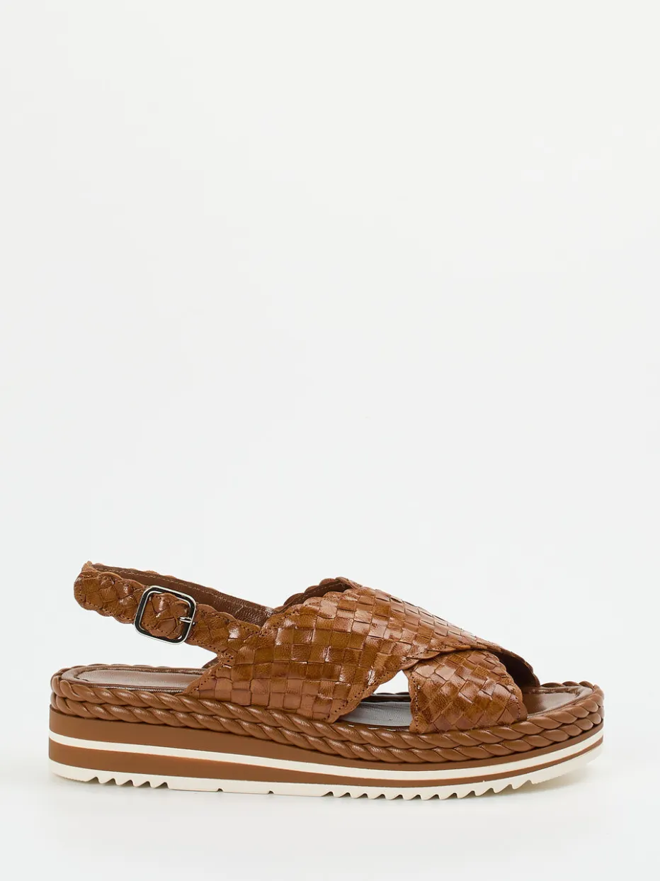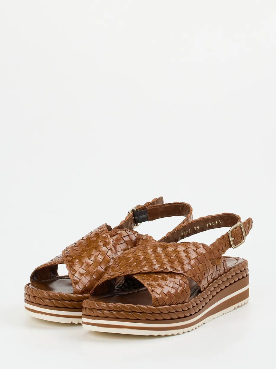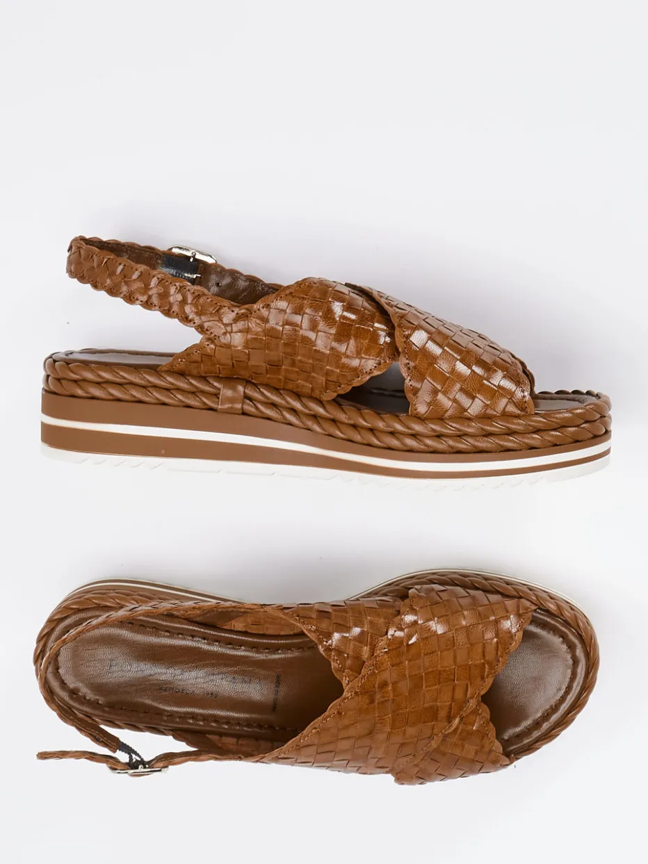 Raffinierte Höhe für sommerliche Leichtigkeit.Pons Quintana präsentiert eine luxuriöse Plateau-Sandale für Damen. Ideal für Stadtspaziergänge oder entspanntes Flanieren im Urlaub bietet dieses Modell Komfort und Stil. Das cognacbraune Flechtleder mit glänzender Optik und gekreuzten Riemen sorgt für einen natürlichen, handwerklichen Look. Der verstellbare Fersenriemen mit silberfarbener Schnalle ergänzt das detailreiche Design, während die leichte Gummisohle mit Profil sicheren Halt bietet. Die Plateausilhouette zitiert dezente Vintage-Vibes und unterstreicht aktuelle Boho- und Craftcore-Trends. Kombiniert mit Leinenkleid oder Strohtasche ideal für lässige Sommermomente. Komfort und Ästhetik in einem sorgfältig gearbeiteten Sommer-Statement von Pons Quintana.