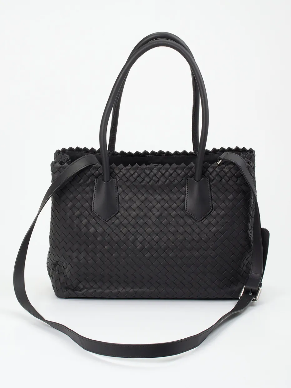 Dieser strukturierte Shopper in edlem Schwarz kombiniert kunstvolle Flechttechnik mit funktionalem Design – ideal für stilbewusste Alltags- und Businesslooks.
