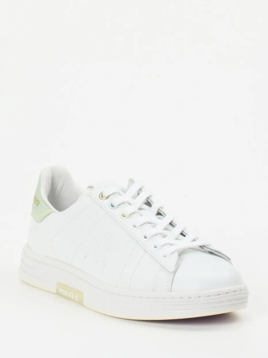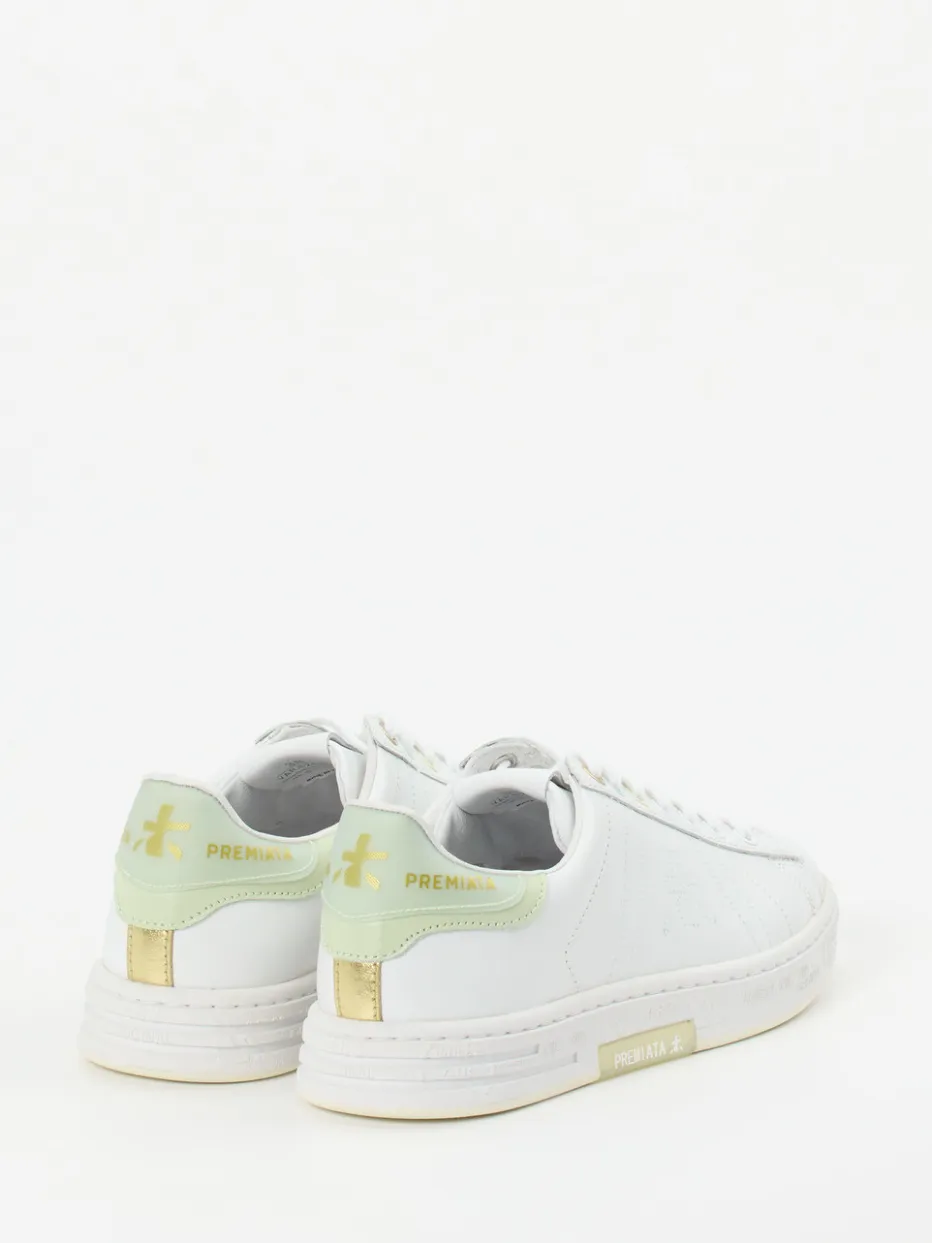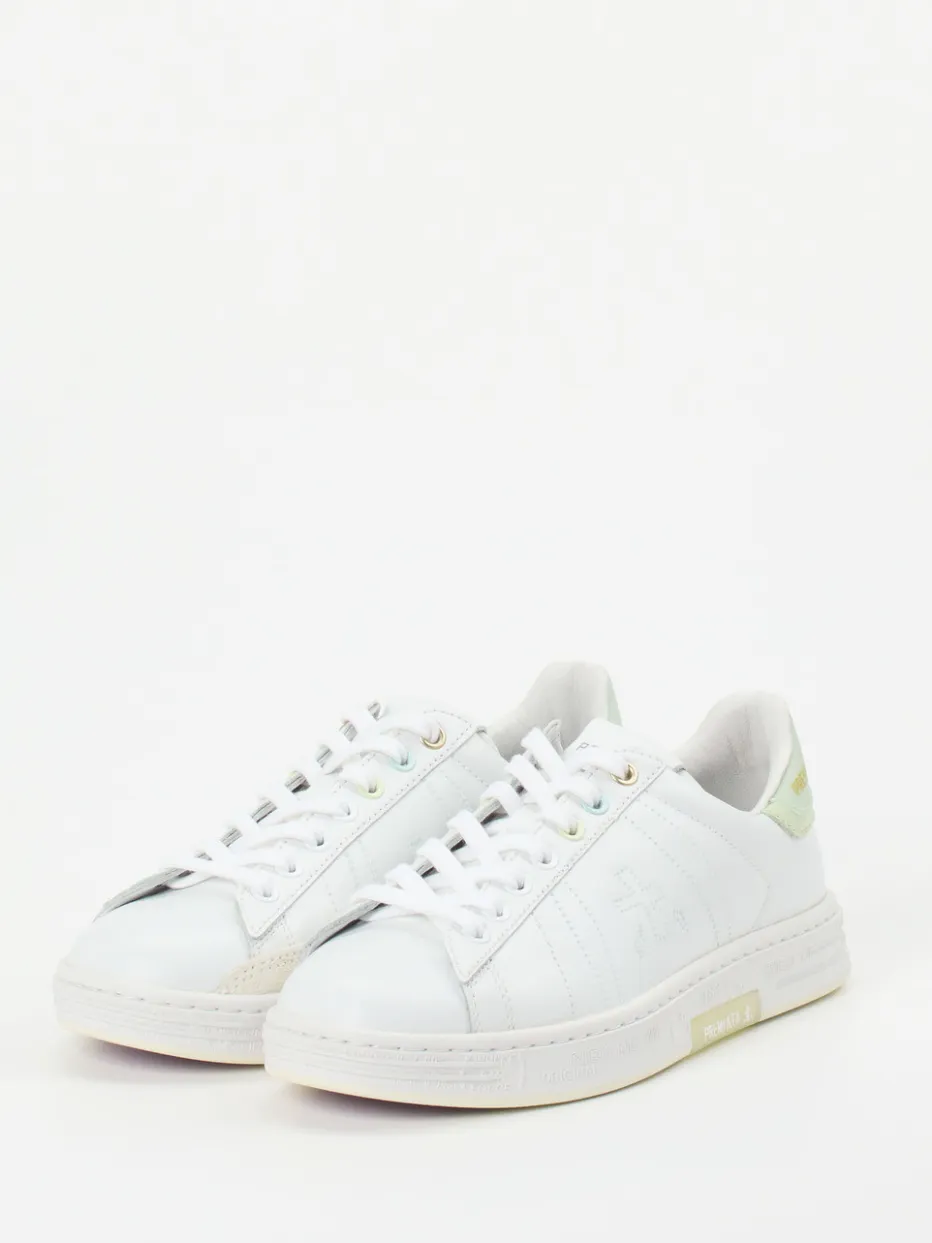 Minimalismus trifft Sommerfrische.Premiata präsentiert einen modernen Sneaker für entspannte Styles in der warmen Jahreszeit. Ein zuverlässiger Begleiter bei Städtereisen oder im Alltag überzeugt dieses Modell durch feines Kalbleder mit glattem Finish. Das klare Weiß wird durch pastellgrüne und goldfarbene Akzente an Ferse und Ösen detailreich ergänzt. Die klassisch-runde Silhouette mit Schnürverschluss und weißer Gummisohle unterstreicht den cleanen Charakter. Das wechselbare Fußbett sorgt für Komfort, während das Design durch dezente Logo-Prägungen abgerundet wird. Attraktiv im Trend: der Pastellfarben-Look Sommer 2024. Ein Premium-Sneaker mit Sinn für urbane Lässigkeit und zurückhaltende Raffinesse.