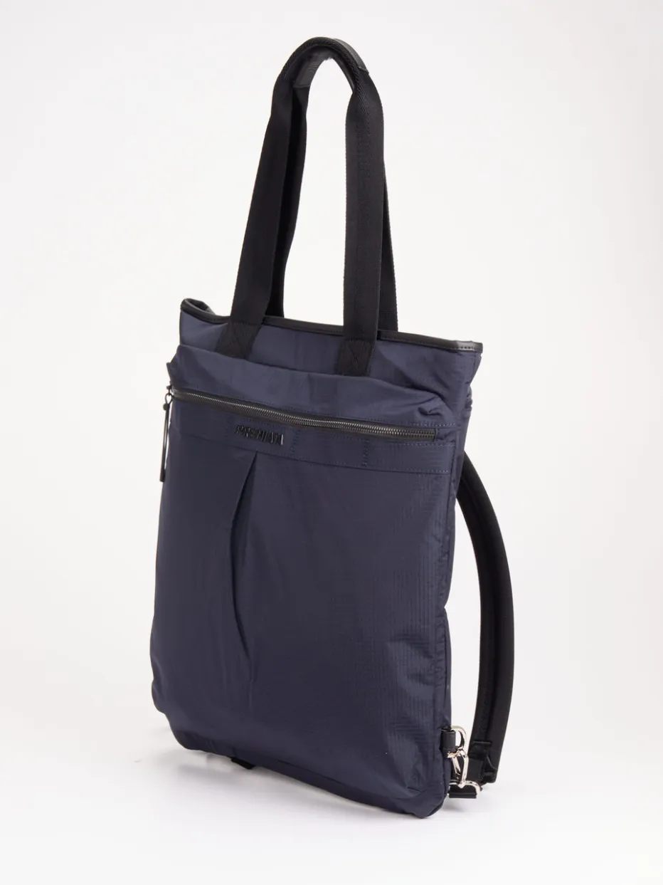 Dieser navyblaue Nylon-Rucksack der Marke Premiata hat es in sich: er ist nicht nur sehr praktisch und geräumig, sondern auch ein echter Verwandlungskünstler. Die beiden Schulterriemen lassen sich an ihren unteren Enden ausklinken und verstauen, sodass im Nu ein schicker Shopper entsteht. Dazu kommen sein großer Stauraum und sein aufgeräumtes Inneres. Durch verschiedene Seitenfächer lassen sich Ihre Unterlagen und Einkäufe gut organisiert verstauen. Das robuste Material ist wasserabweisend. Sicher verschlossen wird alles mit Reißverschlüssen. Dieser Rucksack ist ein echter Allrounder – er vereint praktische Eigenschaften mit einem zeitlosen Design. – Material: Nylon – Farbe: Navyblau – Maße: ca. 47 x 41 x 10 cm (H x B x T) – Verschluss: Reißverschlüsse – Schulterriemen: max. ca. 85 cm, verstellbar, können verstaut werden – Innen: ein Druckknopffach, zwei Steckfächer, ein Reißverschlussfach – Außen: ein weiteres Reißverschlussfach