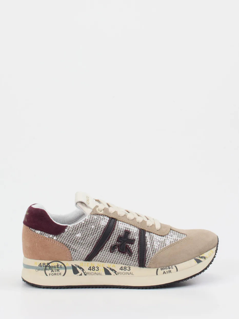 Glanz trifft Retro-Dynamik.Premiata präsentiert mit diesem Low-Top-Sneaker ein stilvolles Modell der besonderen Art. Ob bei entspannten City-Walks oder abendlichen Events – der Sneaker überzeugt mit einem hochwertigen Mix aus Velours/Textil, ergänzt durch Mesh mit feinem Paillettenbesatz. Die Grundfarbe in elegantem Beigegrau trifft auf bordeauxrote Akzente und eine dynamisch bedruckte Vintage-Sohle. Die schmale Silhouette mit klassischer Schnürung und detailreiche Logo-Stickereien unterstreichen den Streetwear-Einfluss mit Retro-Charme. Lässt sich ausdrucksstark zu Oversized-Hoodies oder Crossbody-Bags kombinieren. Ein modischer Eyecatcher mit handwerklicher Handschrift und urbaner Ausstrahlung.