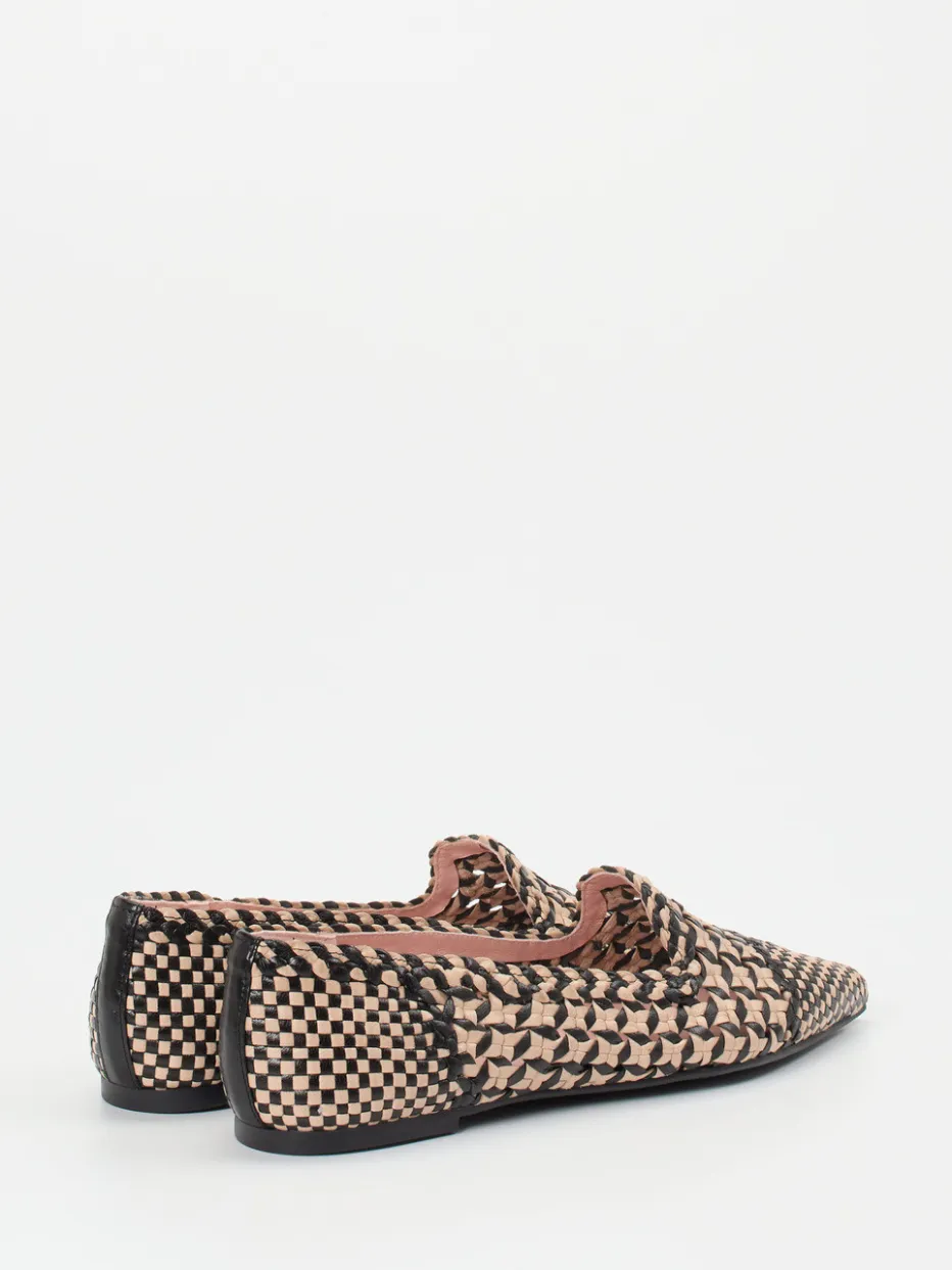 Pretty Ballerinas präsentiert einen stilvollen Damen-Loafer für Alltag und Business. Schmeichelhaft für luftige Sommeroutfits überzeugt das Modell mit spitz zulaufender Form und flacher Gummisohle. Der Loafer besteht aus hochwertigem Lammleder, das durch ein kontrastreiches, zweifarbiges Flechtmuster in Rosé-Beige und Schwarz besonders zur Geltung kommt. Charakteristisch sind die geschlossene Vorderkappe, die schlupffreundliche Form und das gepolsterte Lederfußbett. Die Kombination aus dezenter Vintage-Anmutung und minimalistischer Linienführung macht ihn zum Highlight im „Quiet Luxury“-Trend. Lässt sich ideal zu Leinenhosen und Naturtönen kombinieren. Natürliche Materialien und traditionelles Webdesign definieren den anspruchsvollen Look von Pretty Ballerinas.