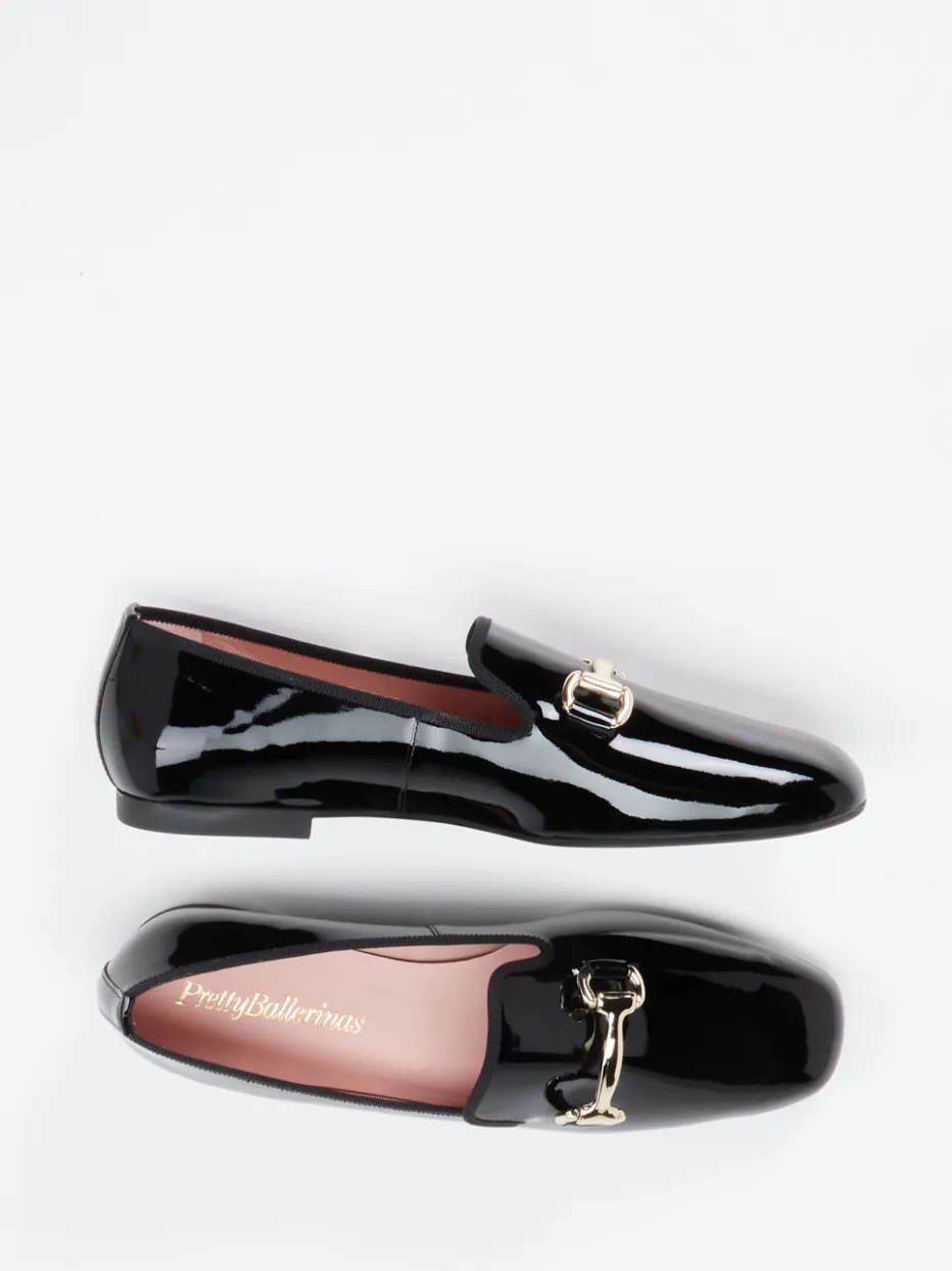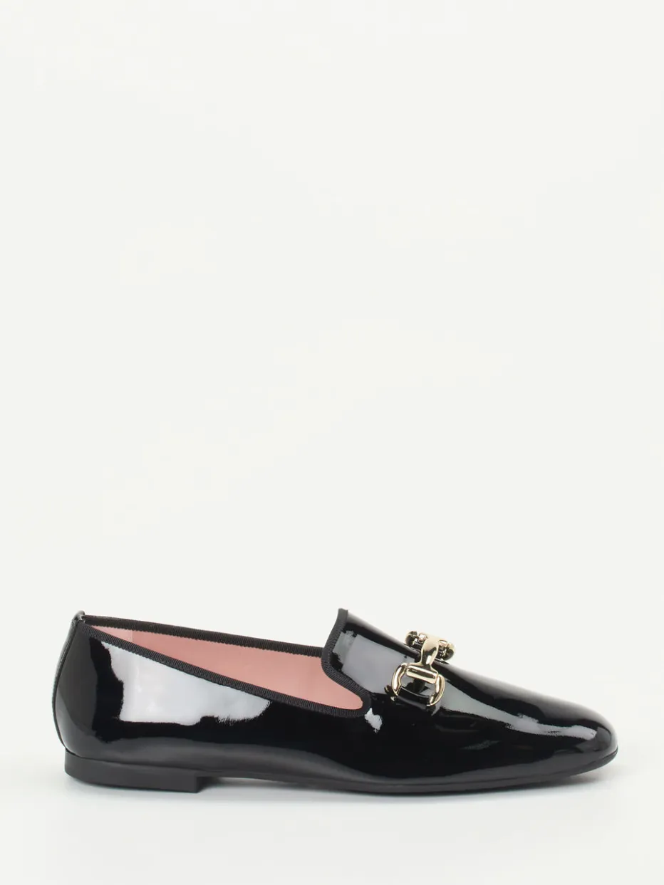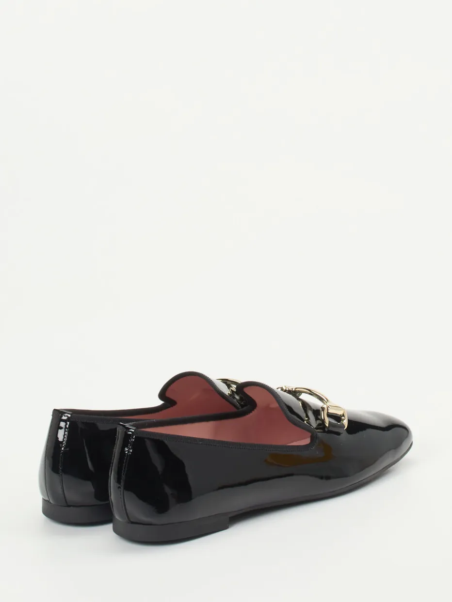 Die hochglänzende Lacklederoberfläche in Schwarz unterstreicht den raffinierten Charakter des Slippers. Die klassische Schlupfform mit sanft abgerundeter Spitze wird von einem tonigen Ripsband eingefasst und von einer goldfarbenen Horsebit-Schnalle akzentuiert. Das Kalblederfutter in zartem Rosa bringt einen dezenten Farbakzent ins Spiel. Mit flacher Gummisohle und weicher Polsterung ist der Loafer komfortabel auf urbanen Wegen tragbar. Stilistisch passt er ideal zum „Quiet Luxury“-Trend und wertet cleane Looks gezielt auf.