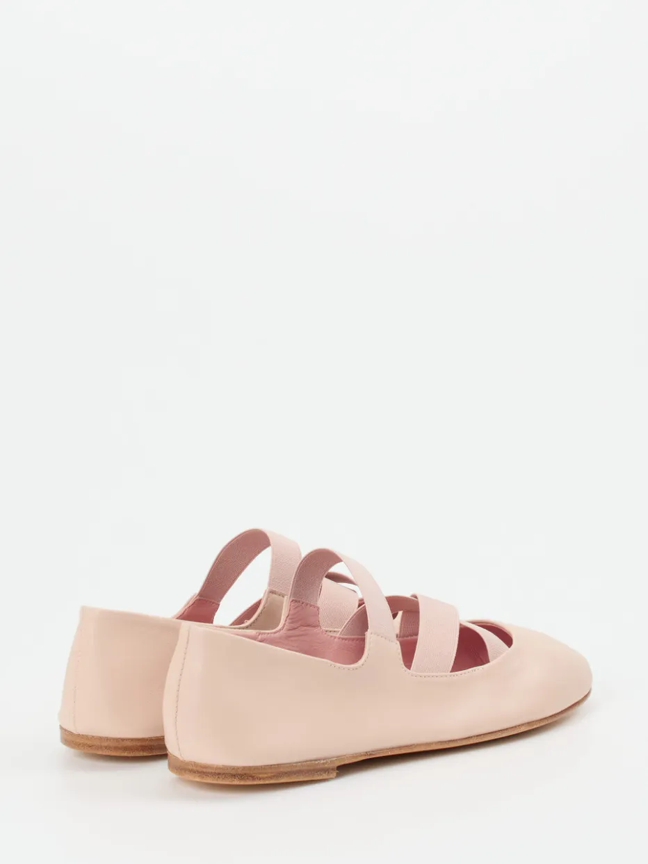 Gefertigt aus feinem Lammleder mit matter Oberfläche passt sich der Schuh angenehm weich an. Die elastischen Kreuzriemen in Ton-in-Ton-Optik bieten Halt, ohne den klassischen Look zu stören. Der zarte Rosaton greift den Trend zu Soft Neutrals auf, die flache Silhouette wirkt puristisch. Die flexible Ledersohle unterstreicht die Leichtigkeit des Modells. Ein echter Favorit für minimalistische Styles – etwa zu Leinen oder feinem Strick.