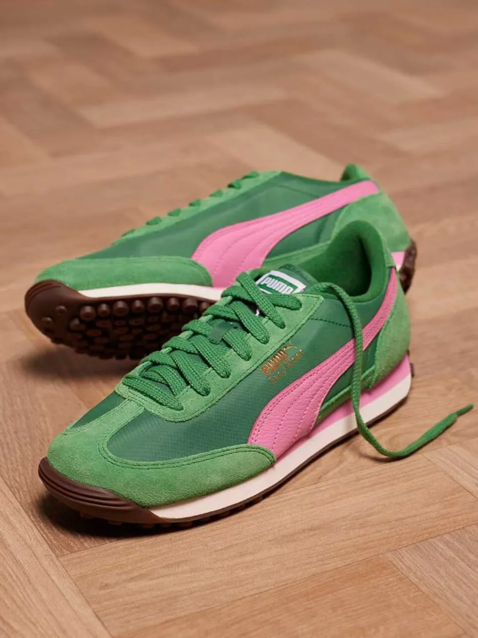 Streetstyle mit Vintage-Charakter.Puma präsentiert einen Unisex-Sneaker der Kategorie Retro-Runners, inspiriert vom Look klassischer 70er-Jahre-Laufschuhe. Grasgrünes Textil und samtig angeschliffenes Veloursleder bilden einen hochwertigen Materialmix, während pinke Seitenstreifen und ein goldfarbener Logoprint augenfällige Akzente setzen. Die flach-zulaufende Form mit profilierter Gummisohle bietet Halt im Alltag und unterstreicht den sportlich-authentischen Stil. Ideal kombinierbar mit Trainingsjacke oder Jeans – ein klares Statement für trendorientierte Streetwear-Looks. Ein Sneaker mit Komfort, Charakter und ikonischer Puma-DNA.