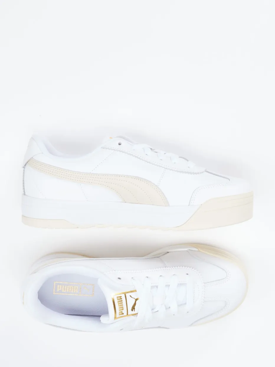 Eleganter Minimalismus im Retro-Stil.Der weiße Sneaker von Puma spielt gekonnt mit Elementen reduzierter Sportswear. Für lässige City-Tage oder müheloses Verreisen bietet das Modell zuverlässigen Komfort. Gefertigt aus glattem Leder mit synthetischer Anmutung und Textilfutter, wirkt es besonders hochwertig. Goldfarbene Logo-Applikationen setzen an Zunge, Seite und Ferse edle Akzente. Die flache Silhouette mit profilierter Gummisohle passt zu puristischen Sommer-Outfits und folgt dem Trend zu Quiet Luxury und gedeckten Cream Tones. Optimal kombinierbar mit hellen Basics und Accessoires in Canvas oder Leinen. Eine gelungene Fusion aus Retro-Charme und zeitgemäßem Understatement – typisch Puma.