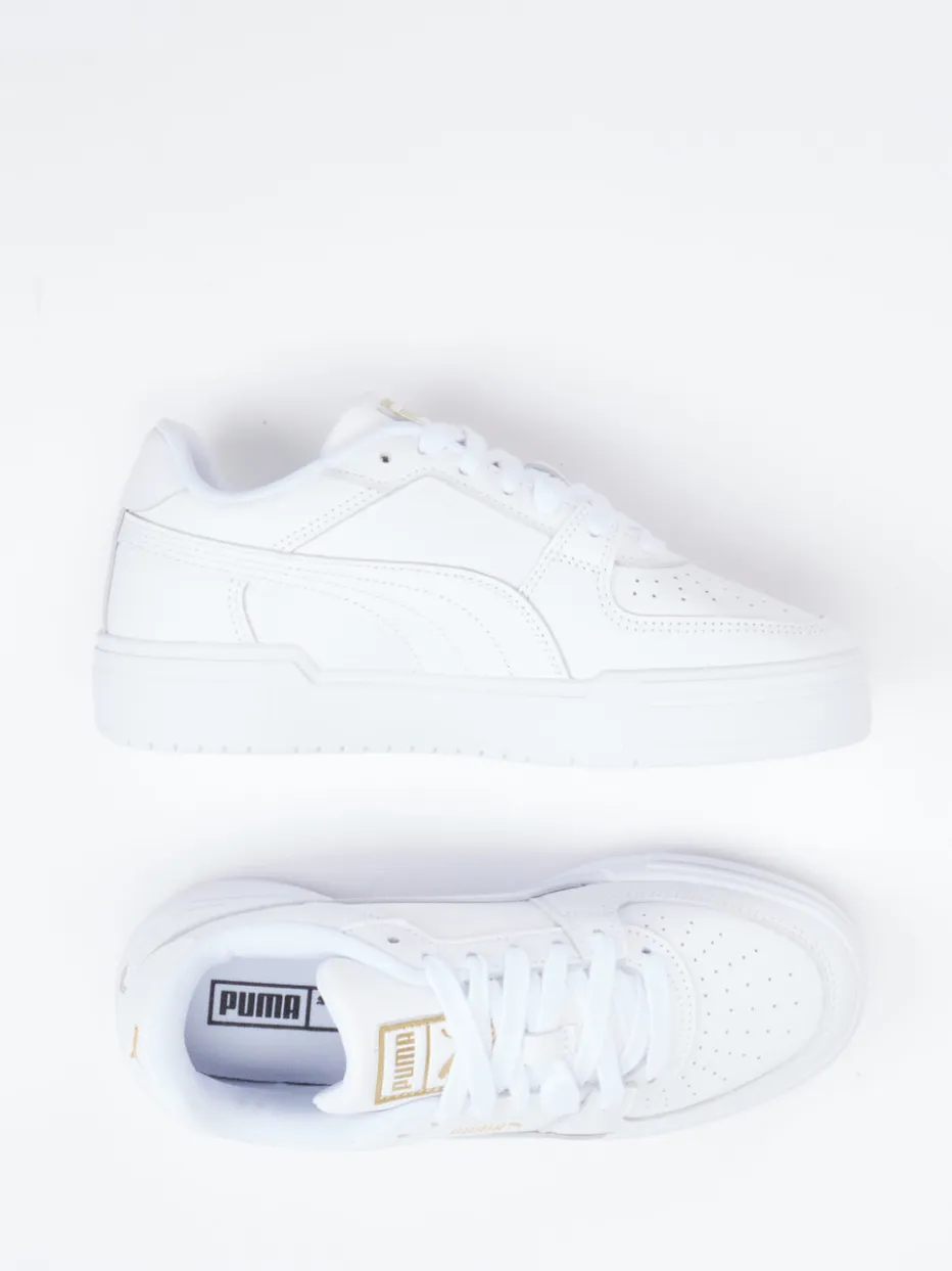 Minimalistische Ästhetik mit Stil-Upgrade.Der weiße Sneaker von Puma interpretiert den klassischen Low-Top neu. Für entspannte City-Tage oder legere Office-Looks bietet dieser Schuh mit seinem glatten Glattleder und textilen Innenfutter angenehmen Komfort. Die perforierte Zehenkappe sorgt für dezente Belüftung, während goldfarbene Logo-Details an Zunge und Ferse das reduzierte Design elegant akzentuieren. Subtile Streetwear trifft auf den „Quiet Luxury“-Trend der Saison. Ideal kombinierbar mit schlichten Casual-Outfits und urbanen Styles. Ein stilvoller Basicsneaker mit markentypischer Klarheit und Komfort.