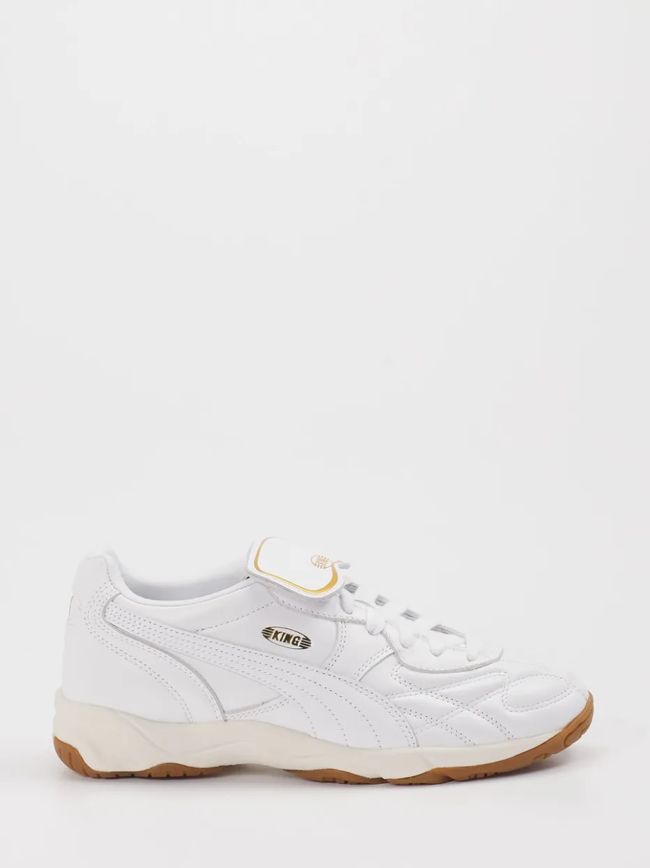Ideal für sportlich geprägte Freizeit-Looks, vereint der Unisex-Sneaker weißes Leder mit glänzender Oberfläche und goldfarbenen Logo-Details. Die klassische Low-Top-Silhouette betont die klare Linienführung, während eine markante beige-hellbraune Gummisohle mit Profil Struktur verleiht. Der Mix aus Schnürung und Klettverschluss an der Zunge bietet sicheren Halt. Dank der Anmutung im Y2K-Stil ist das Modell ein echtes Trend-Statement. Kombiniert mit weißen Logo-Sportsocken oder sportlicher Umhängetasche entfaltet es seine volle Wirkung.