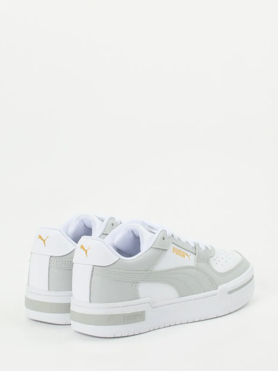 Cleanes Design mit Retro-Note.Die Marke Puma präsentiert mit diesem Sneaker eine sportlich-legere Interpretation des klassischen Court-Stils. Ob bei entspannten City-Touren oder dem Weg zum Fitnessstudio – die klare Silhouette in Weiß und Hellgrau trifft den Streetwear-Zeitgeist. Hochwertiges Leder wurde glatt verarbeitet und durch goldfarbene Logos sowie Ton-in-Ton-Nähte stilvoll ergänzt. Der gepolsterte Schaftrand und die herausnehmbare Innensohle sorgen für angenehmen Tragekomfort im Alltag. Dank seiner cleanen, reduzierten Optik passt der Sneaker flexibel zu lässigen Outfits mit Jogginghose oder Denim. Puma vereint Funktionalität mit ikonischer Retro-Ästhetik – ein Stilstatement mit Komfortanspruch.