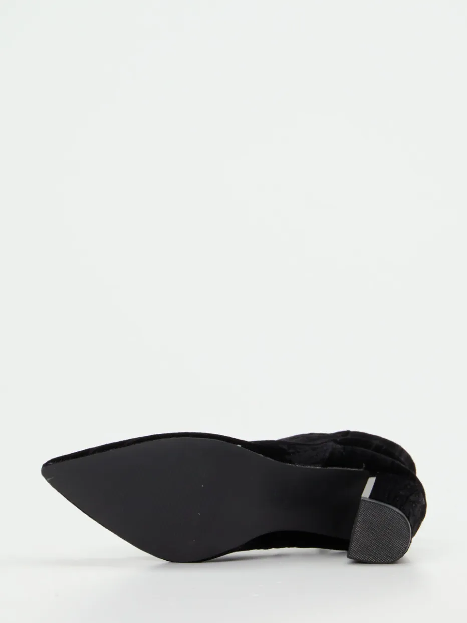 Der samtige Look trifft auf moderne Eleganz: Mit spitz zulaufender Form und metallischem Absatzdetail bieten diese Ankle Boots ein stilvolles Statement für designaffine Looks.