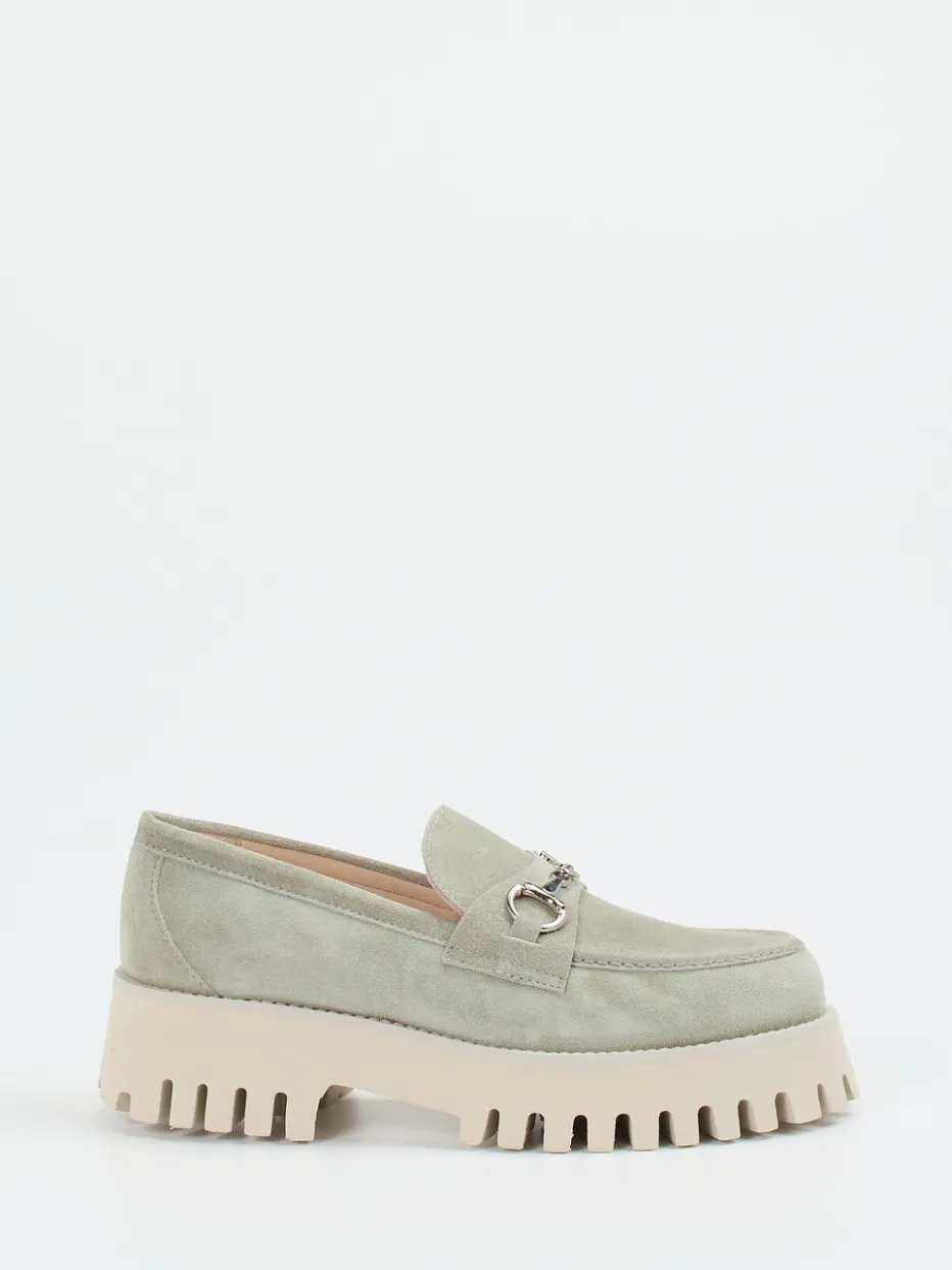 Weiches Veloursleder in Salbeigrün trifft auf eine moderne Leichtzellsohle mit Profil – ein Loafer, der modische Substanz beweist und Komfort stilvoll interpretiert.