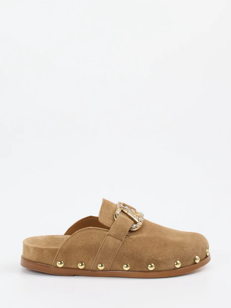 Goldfarbene Nieten und eine strassbesetzte Dornschnalle unterstreichen die luxuriöse Detailsprache, ohne den lässigen Charakter zu verlieren. Die Gummisohle sorgt für guten Halt, während der offene Fersenbereich einen unkomplizierten Einstieg bietet. Ideal für stilvolle Freizeit-Looks mit Boho-Anmutung.