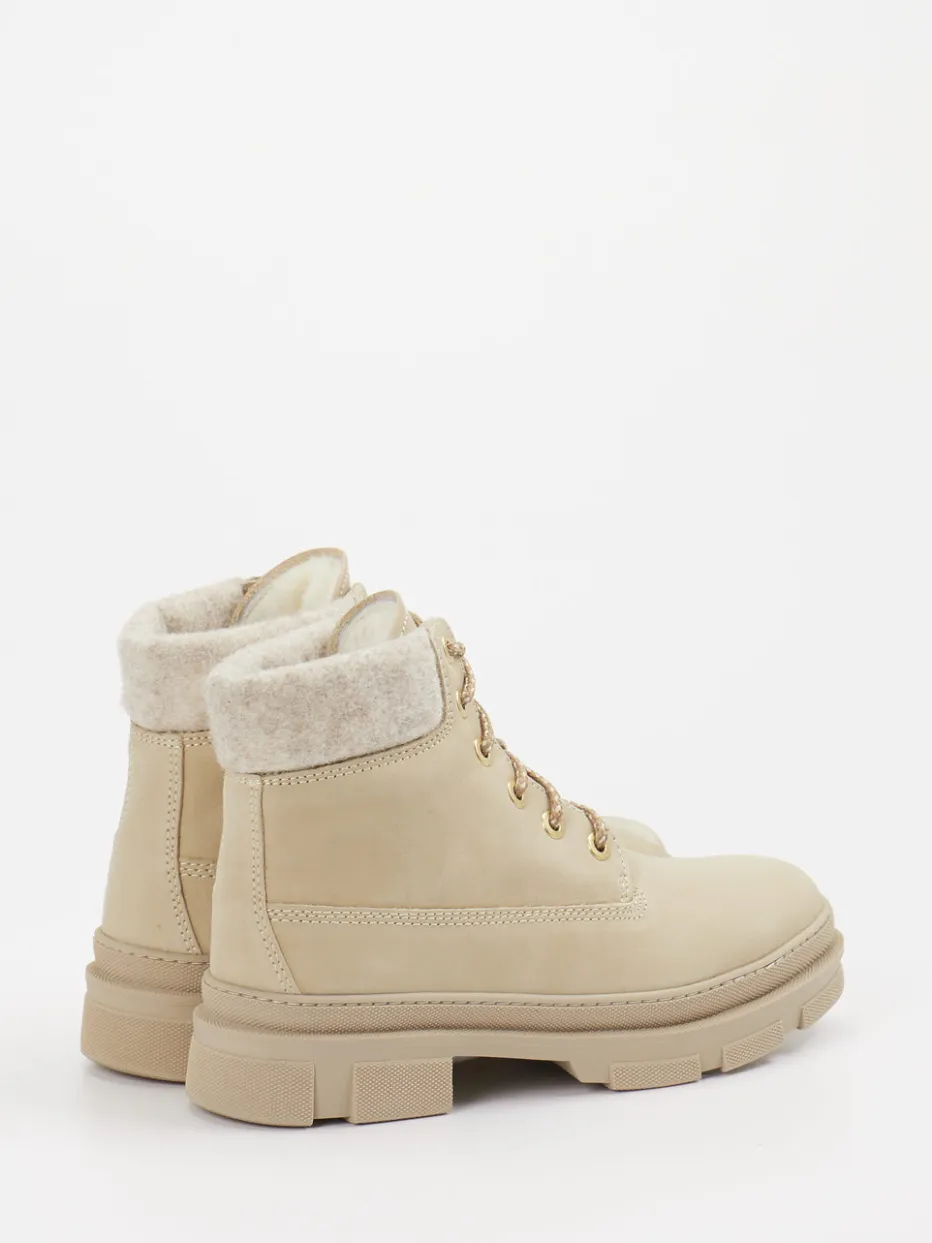 Die Marke Ralph Harrison Country präsentiert robuste Damen-Schnürboots für Freizeit und Outdoor. Das beige Nubukleder zeigt sich in matter Veloursoptik und schafft mit tonalen Nähten eine dezente Textur. Die klassische, knöchelhohe Silhouette wird akzentuiert durch goldfarbene Metallösen und einen weich gepolsterten Textilschaft. Die griffige Gummisohle mit 3,5 cm Absatz und 2 cm Plateau bietet rutschfesten Halt auf wechselndem Untergrund. Dank gefüttertem Lammfell bleibt es auch an kalten Tagen angenehm warm. Inspiriert von Utility-Elementen und Quiet Luxury setzt das Design auf Understatement. Kombinierbar mit Steppjacke und Mütze für einen urban-funktionalen Look. Komfort und Stil im Zeichen saisonaler Trends – ein hochwertiges Modell mit durchdachtem Finish.