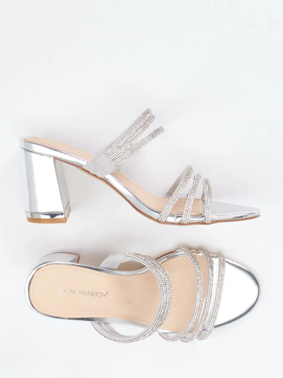 Die Damenpantolette von Ralph Harrison kombiniert glamouröse Details mit klarer Formensprache. Für Abende mit Anspruch bietet sie perfekten Mix aus Wow-Faktor und Komfort. Silberfarbenes Metallicleder trifft auf glänzende Strassdetails auf mehrfach geführten Riemchen. Der stabile Blockabsatz mit ca. 6,5 cm Laufhöhe steht für sicheren Halt und wirkt durch das metallische Finish besonders edel. Offene Silhouette, weich gepolstertes Fußbett und dezente Profilsohle runden das Design ab. Ideal zum eleganten Abendkleid oder modernen Jumpsuit. Ein stilvolles Modell für modebewusste Anlässe mit dem typisch femininen Flair von Ralph Harrison.