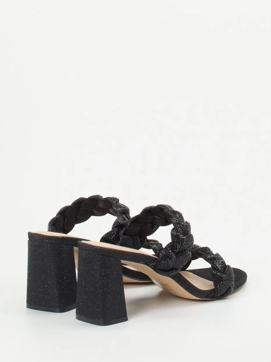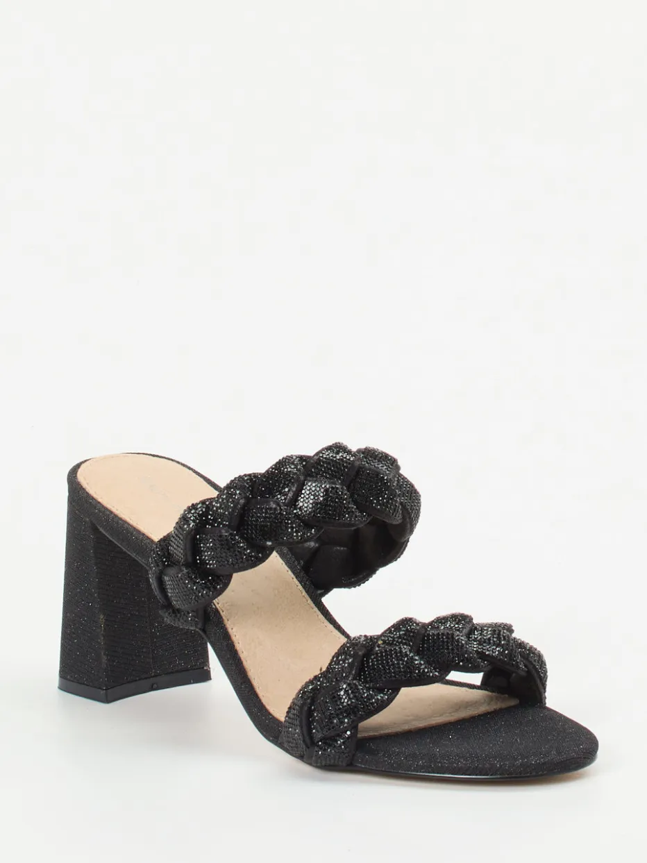 Strukturierte Glitzerriemen in geflochtener Optik und ein stabiler Blockabsatz verleihen dieser Pantolette einen eindrucksvoll eleganten Look mit hohem Tragekomfort.