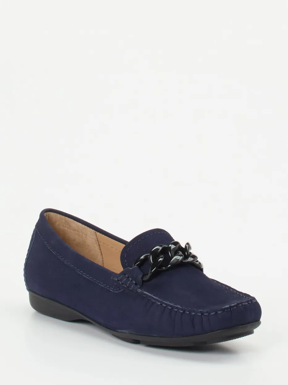 Für all jene, die auch im Alltag Wert auf eleganten Komfort legen, überzeugt dieser Slipper mit samtig angeschliffenem Nubukleder in tiefem Tintenblau. Die klassische Silhouette wird durch eine schwarze Gliederkette und eine feine Mokassinnaht stilvoll akzentuiert. Eine flexible Gummisohle mit Profil sowie das weich gepolsterte Fußbett unterstützen ein angenehmes Tragegefühl. Inspiriert vom Preppy-Look, passt das Modell zu Culottes ebenso wie zu Business-Outfits.