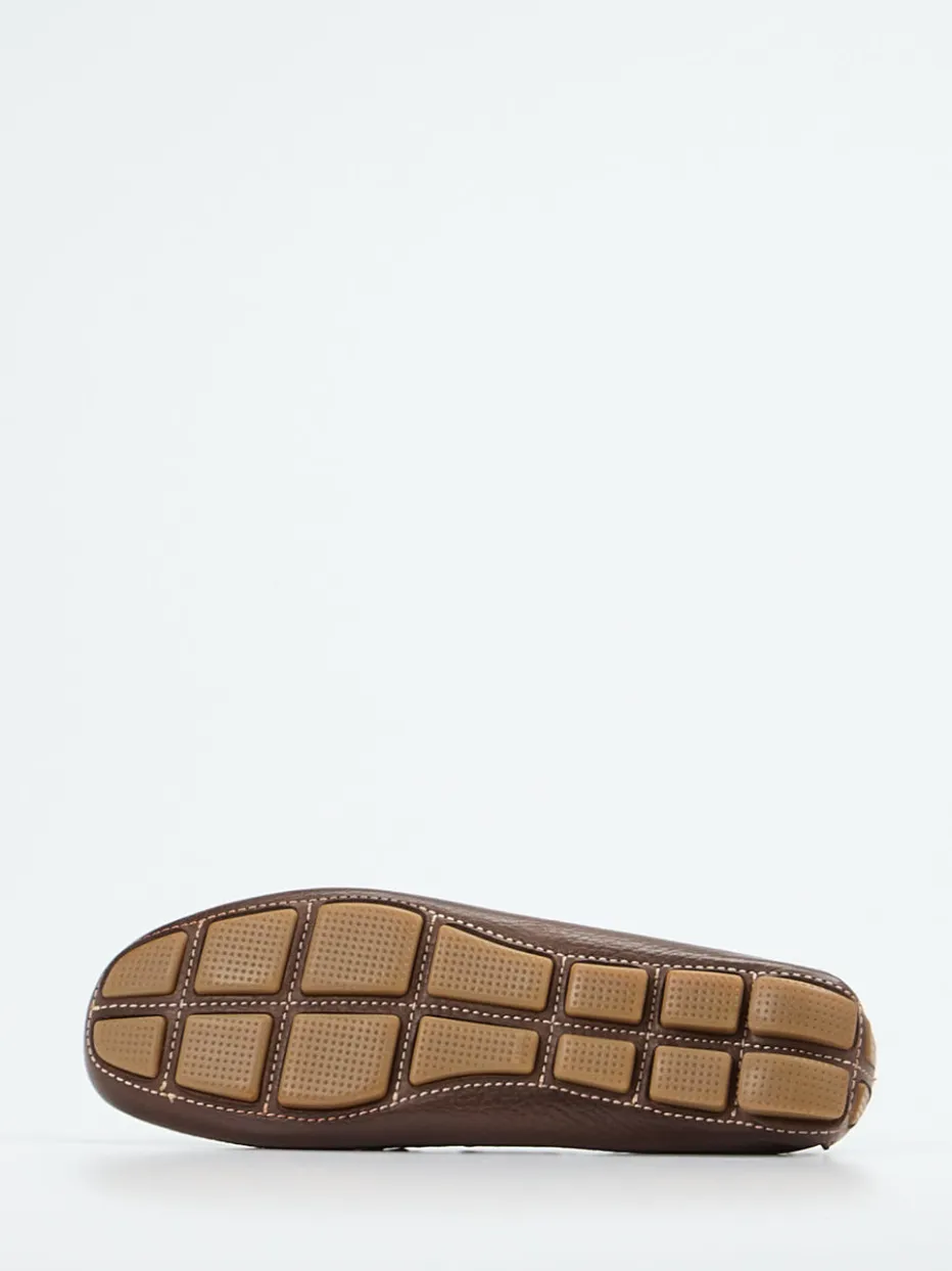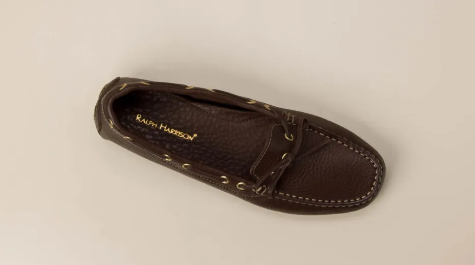 Flexibel, weich und leicht sind die Attribute dieses Mokassins der Marke Ralph Harrison. Das ungefütterte, sportlich genarbte Kalbleder hat eine bestechend schöne dunkelbraune Farbe. Typisch für den Stil der Bootsschuhe ist der umlaufende Senkel. Die großen, messingfarbenen Ösen schmücken und geben Glanz. Die Sohle ist an der Ferse hoch gezogen, sie besteht aus honigfarbenen Gummikassetten. Mit diesem Mokassin finden Sie ein unkompliziertes Accessoire für sommerliche Tage.