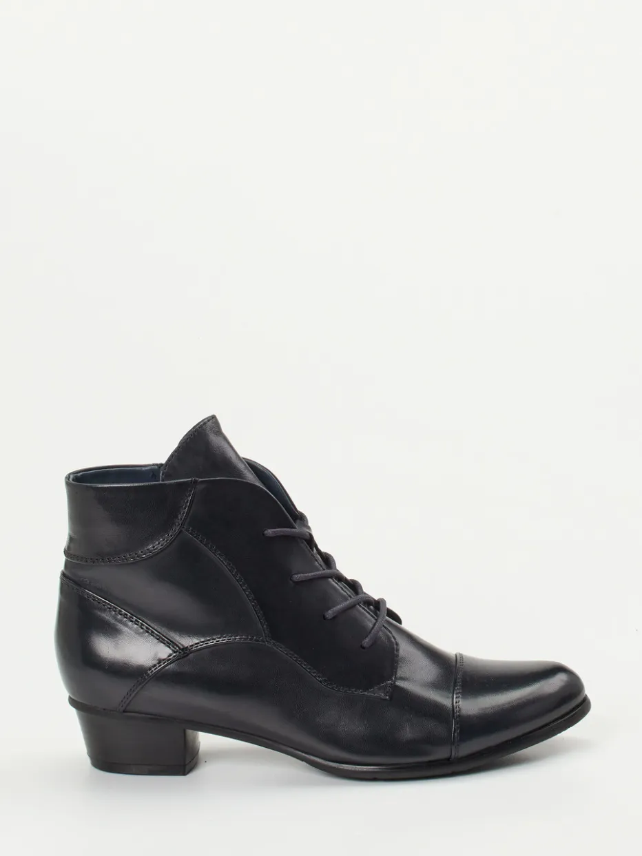 Eleganz für Alltag und Business.Die Marke Ralph Harrison präsentiert eine klassische Damen-Schnürstiefelette mit feinem Gespür für Detail und Qualität. Perfekt für Büro und Freizeit steht diese Stiefelette für einen souveränen Look bei jedem Wetter. Gefertigt aus nachtblauem Kalbleder mit leicht glänzender Oberfläche, kombiniert sie glatte und samtig angeschliffene Velours-Partien zu einem harmonischen Materialmix. Der knöchelhohe Schaft mit femininer Taillierung und dezente Ton-in-Ton-Nähte unterstreichen die klare Linienführung. Funktionale Details wie ein seitlicher Reißverschluss und die rutschhemmende Gummisohle mit Profil sorgen für Komfort und sicheren Halt. Inspiriert von „Quiet Luxury“ trifft Design auf Anspruch. Ralph Harrison verbindet feminine Silhouette mit authentischer Hochwertigkeit.