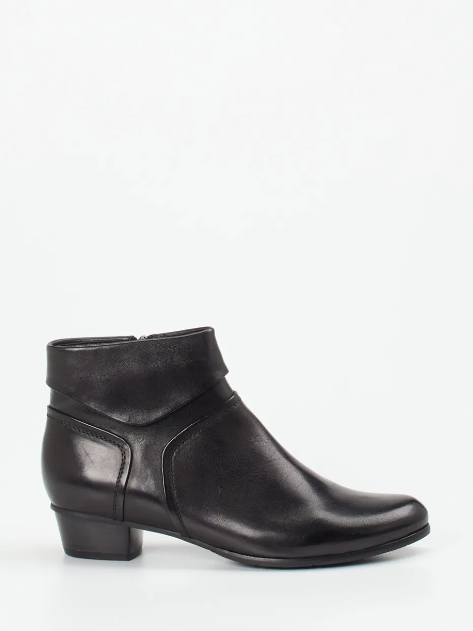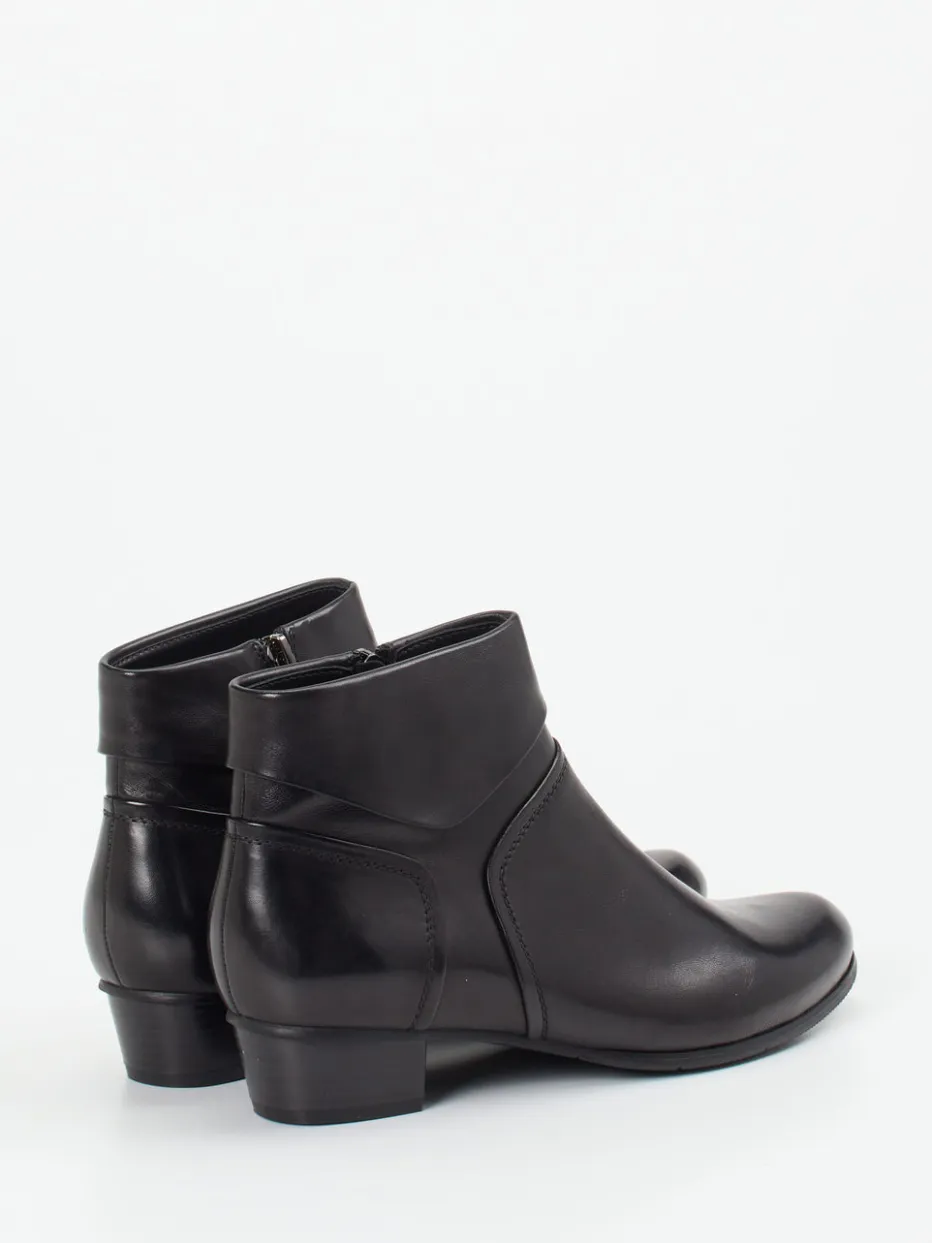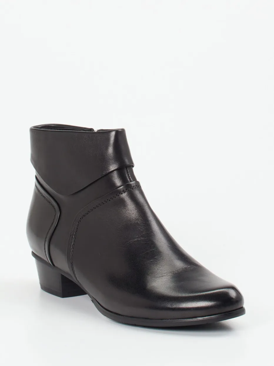 Stilvoll durch Herbst und Winter.Die Damen-Stiefeletten von Ralph Harrison setzen auf minimalistischen Chic mit hochwertiger Ausstrahlung. Für Büro oder City kombiniert das Modell echten Lammnappa-Komfort mit eleganter Zurückhaltung. Das handschuhweiche Leder in tiefem Schwarz zeigt einen dezenten Glanz und harmoniert mit der klaren Form und dem komfortablen 3 cm Blockabsatz. Ton-in-Ton-Nähte, ein seitlicher Reißverschluss und strukturierende Overlays sorgen für moderne Akzente. Die Gummisohle bringt Trittsicherheit, das warme Fleecefutter erhöht den Komfort. Passend zu geradliniger Businesswear oder dunklem Wollmantel. Ein stilsicherer Allrounder mit charaktervoller Linie und markentypischer Detailqualität.