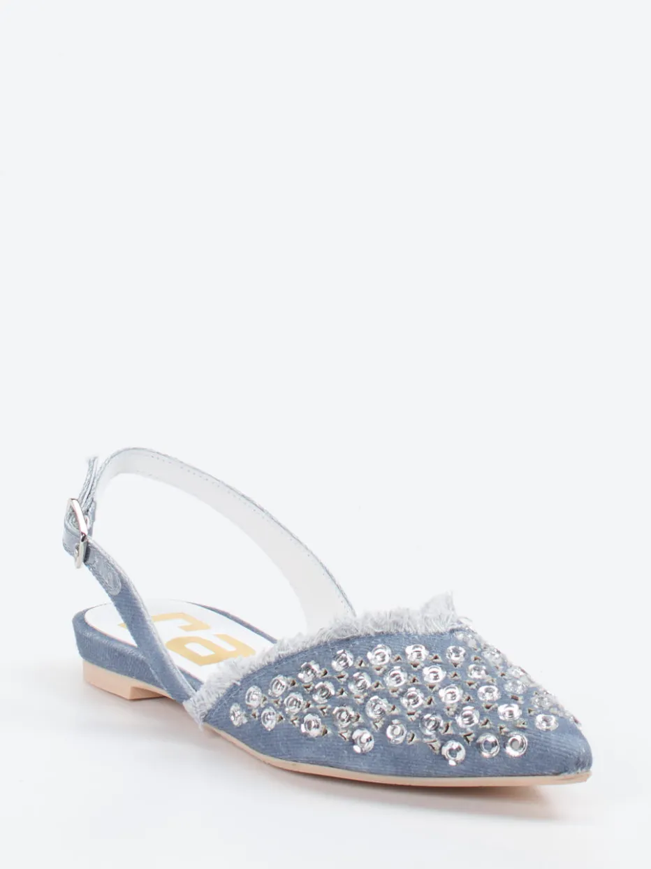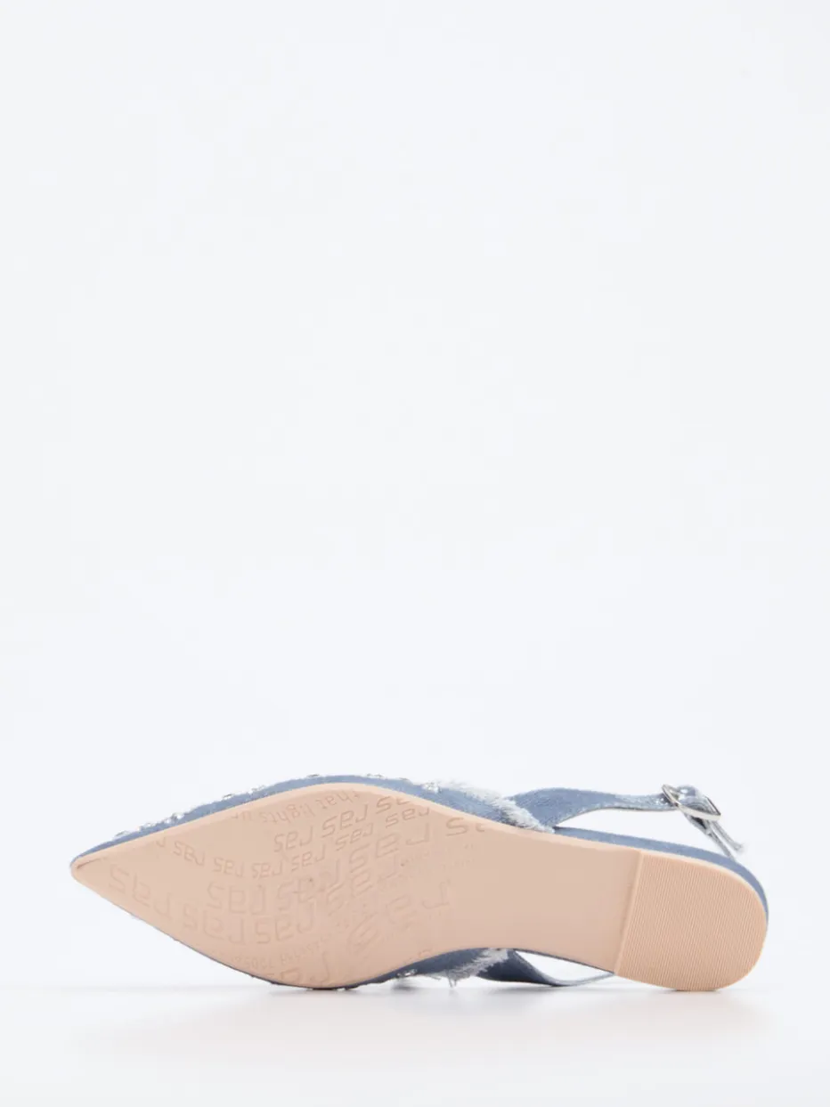 Y2K trifft Streetstyle: Die Slingback-Ballerinas von RAS kombinieren fransigen Denim mit glitzernden Strasssteinen zu einem modernen Look voller Ausdrucksstärke.