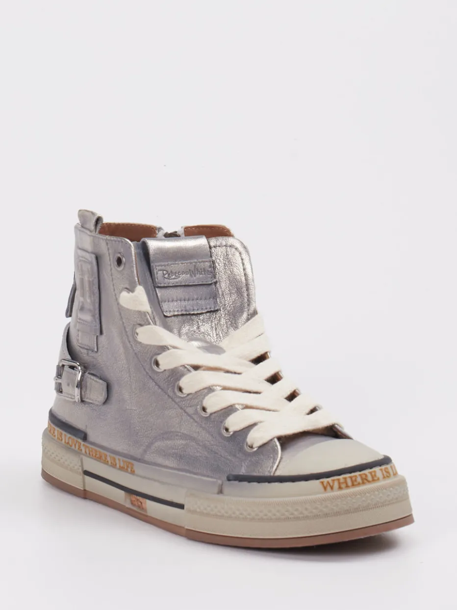Expressiver Stil mit Urban-Edge.Rebecca White interpretiert den High-Top Sneaker in silberfarbenem Metallicleder neu. Ideal für unkonventionelle Casual-Looks in Stadt und Szene: Das Modell überzeugt mit seinem auffällig glänzenden Obermaterial, das samtig angeschliffen erscheint und aus metallic-beschichtetem Leder gefertigt ist. Optische Akzente setzen die klassische Silhouette, eine kontrastierende Schnürung, der seitliche Reißverschluss sowie eine markante Zierschnalle. Auffällig gestaltet zeigt sich die Sohle mit ihrem geprägten Statement-Schriftzug. Inspiriert von Retro-Basketball und Streetwear ist der Sneaker besonders für trendorientierte Outfits geeignet – etwa kombiniert mit oversized Hoodie oder Metallic-Bag. Rebecca White verbindet Stilbewusstsein mit aufmerksamkeitsstarken Details.