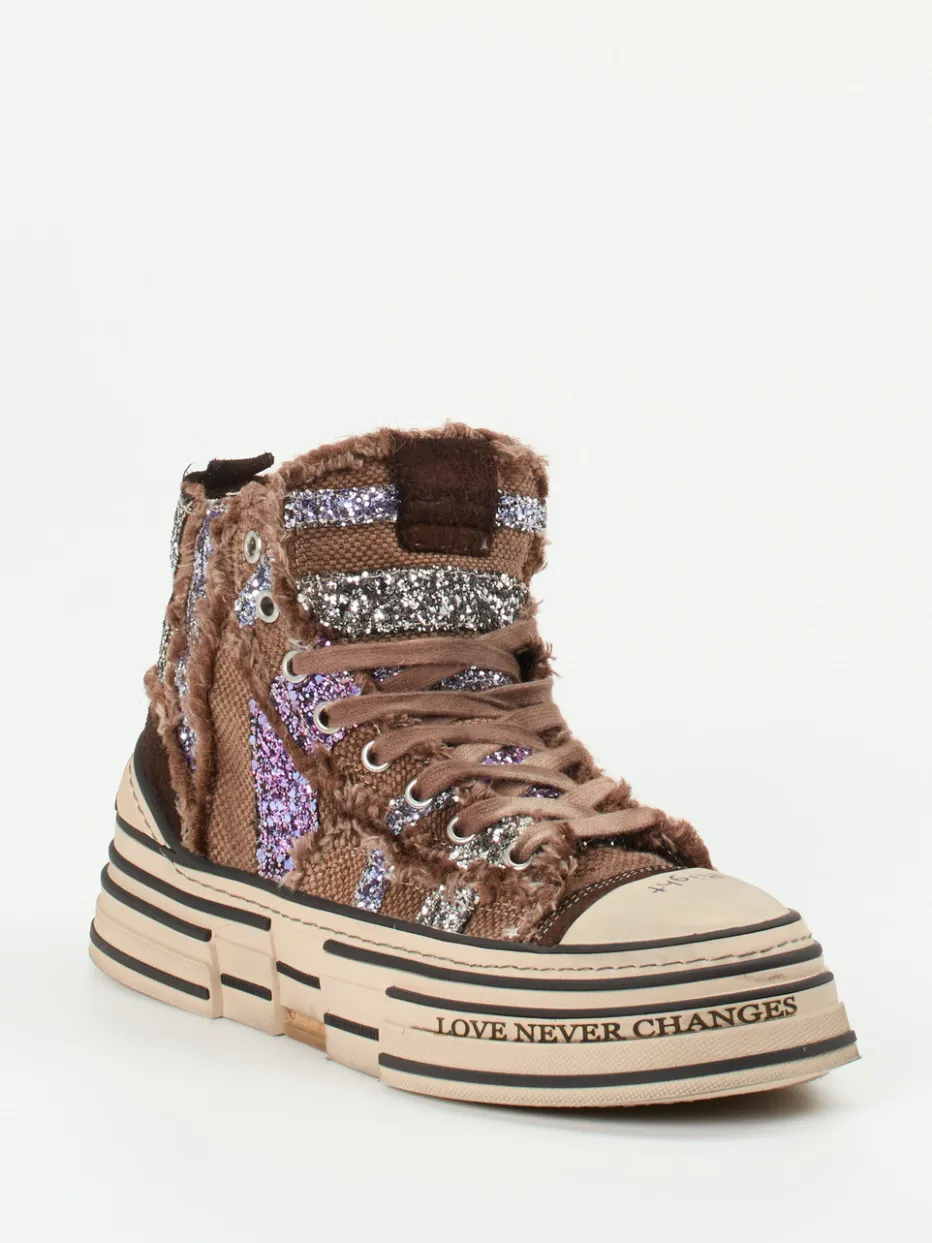 Der auffällige High-Top-Sneaker kombiniert grobtexturiertes Textil mit glamourösem Glitzerfinish – ein expressives Statement für trendbewusste Looks mit Streetstyle-Charakter.