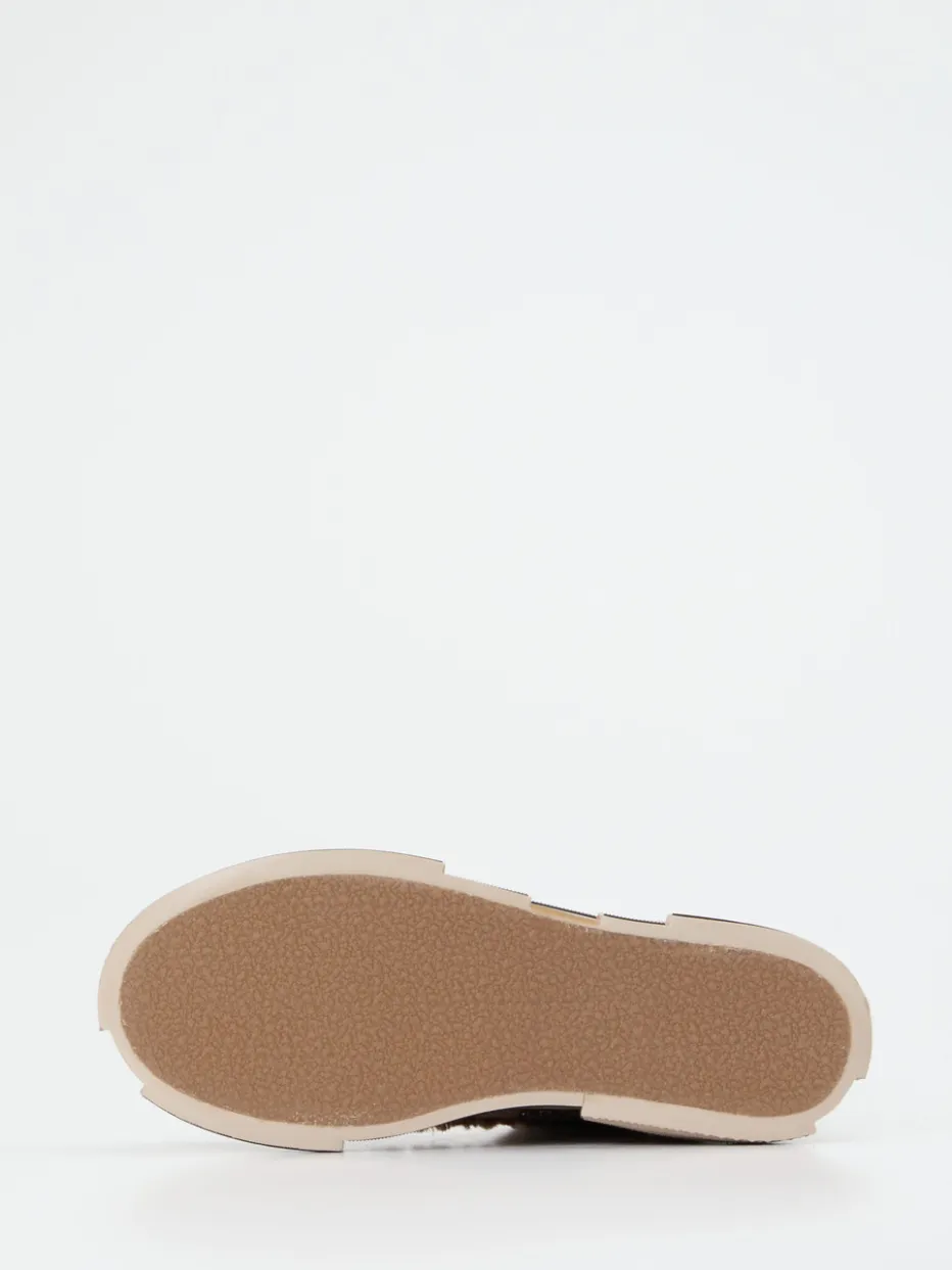 Rebecca White interpretiert den klassischen High-Top Sneaker neu. Dieses Damenmodell verbindet fransig veredeltes Textil mit Veloursleder und glitzerndem Besatz in Gold, Silber und Altrosa. Die beigebraune Patchwork-Optik trifft auf eine kräftige Plateausohle aus Gummi mit Kontraststreifen und prägnantem Slogan „LOVE NEVER CHANGES“. Schnürung und Zuglasche sorgen für praktischen Komfort, während das chunky Design perfekt zur aktuellen Streetstyle-Ästhetik passt. Ideal zu Oversized-Sweatern oder Metallic-Accessoires.