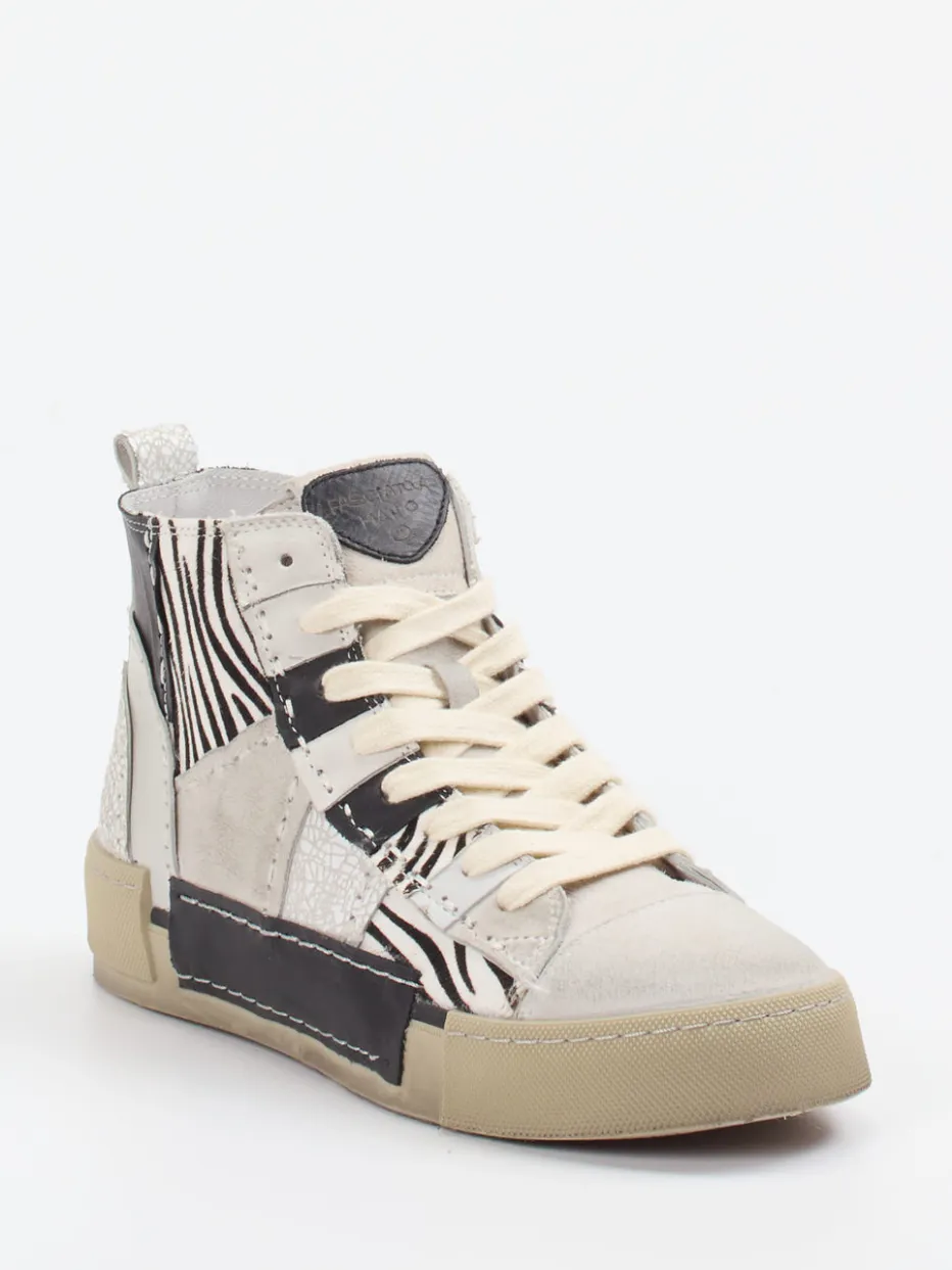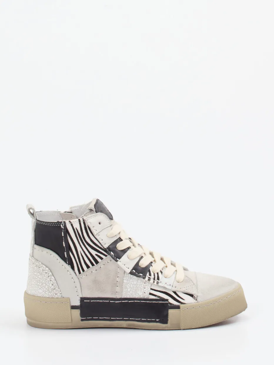 Blickfang mit Animal-Attitüde.Rebecca White präsentiert mit diesem High-Top-Sneaker ein aufregendes Damenmodell voller Kontrast und Charakter. Das Design spricht modebewusste Großstadtliebhaberinnen an, die Komfort und Individualität verbinden möchten. Gefertigt aus hochwertigem Veloursleder, kombiniert mit samtigen und strukturierten Elementen in Zebrafell-Optik, entsteht eine ausdrucksstarke Patchwork-Ästhetik. Hellbeiges Leder trifft auf schwarze und weiße Akzente, kontrastierende Nähte und einen faszinierenden Animal-Print. Die Schnürung und der seitliche Reißverschluss sorgen für optimalen Sitz, während die robuste Gummisohle alltagstaugliche Stabilität garantiert. Inspiriert von der Streetwear und aktuellen Mixed-Materials-Trends der Saison. Ein stilistisches Statement mit urbanem Profil und komfortabler Ausstattung – typisch Rebecca White.
