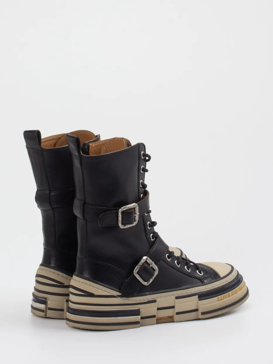 Chunky Design trifft Streetstyle-Coolness.Rebecca White zeigt mit diesem schwarzen Schnürboot eine stilsichere Verbindung aus Modernität und Ausdruck. Für spontane City-Ausflüge oder lange Nächte sorgt das weiche Lammleder in matter Optik für angenehmen Tragekomfort. Metallschnallen, ein seitlicher Reißverschluss und silberfarbene Ösen betonen die edgy Konstruktion, während die kontrastreich gestreifte Gummisohle mit Statement-Schriftzug ein echter Blickfang bleibt. Die chunky Silhouette mit gepolsterter, herausnehmbarer Innensohle rundet den Look funktional ab. Als modischer Akzent zu Cargohose oder oversized Hoodie bestens geeignet. Ein Statement-Boot mit maximalem Stilwert und markentypischer Detailfreude.