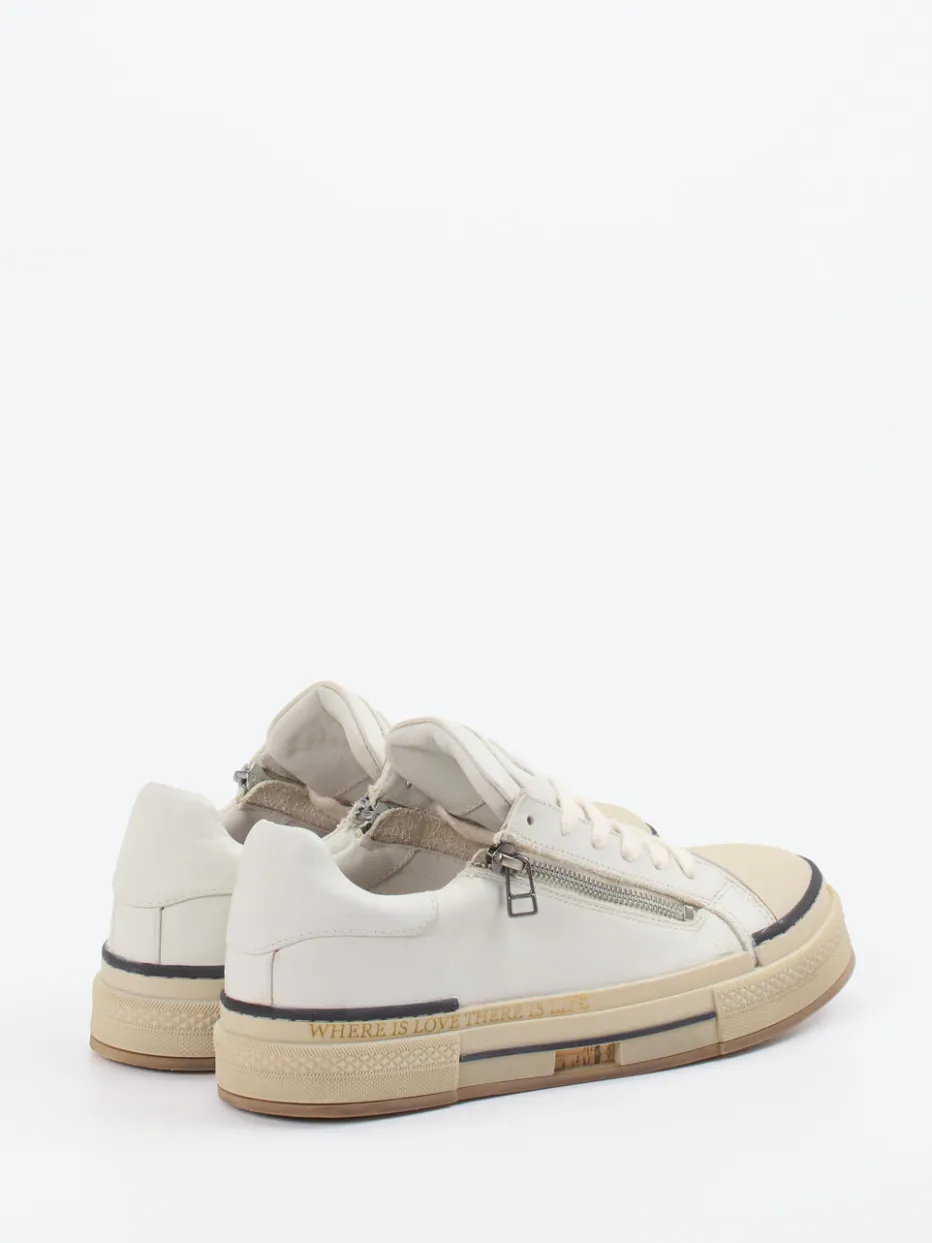 Für stilbewusste Tage in der Stadt bietet dieser cremeweiße Sneaker dank seitlichem Reißverschluss und gepolstertem Innenleben funktionalen Komfort. Die matte Lederoberfläche, kombiniert mit einer schwarzen Profilsohle und goldgeprägtem Schriftzug, bringt den Typografie-Trend auf die Straße. Der Mix aus Schnürung und Reißverschluss unterstreicht den streetwear-inspirierten Look. Ideal zu neutralen Streetstyle-Outfits oder als Kontrast zu femininen Pieces.