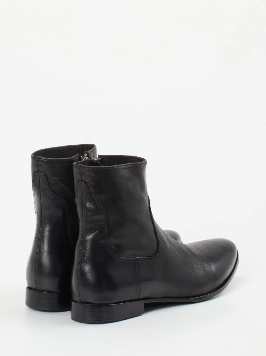 Diese schmal geschnittene Stiefelette vereint fein strukturiertes Lammleder mit eleganter Formgebung und einem modernen Zipper-Detail.