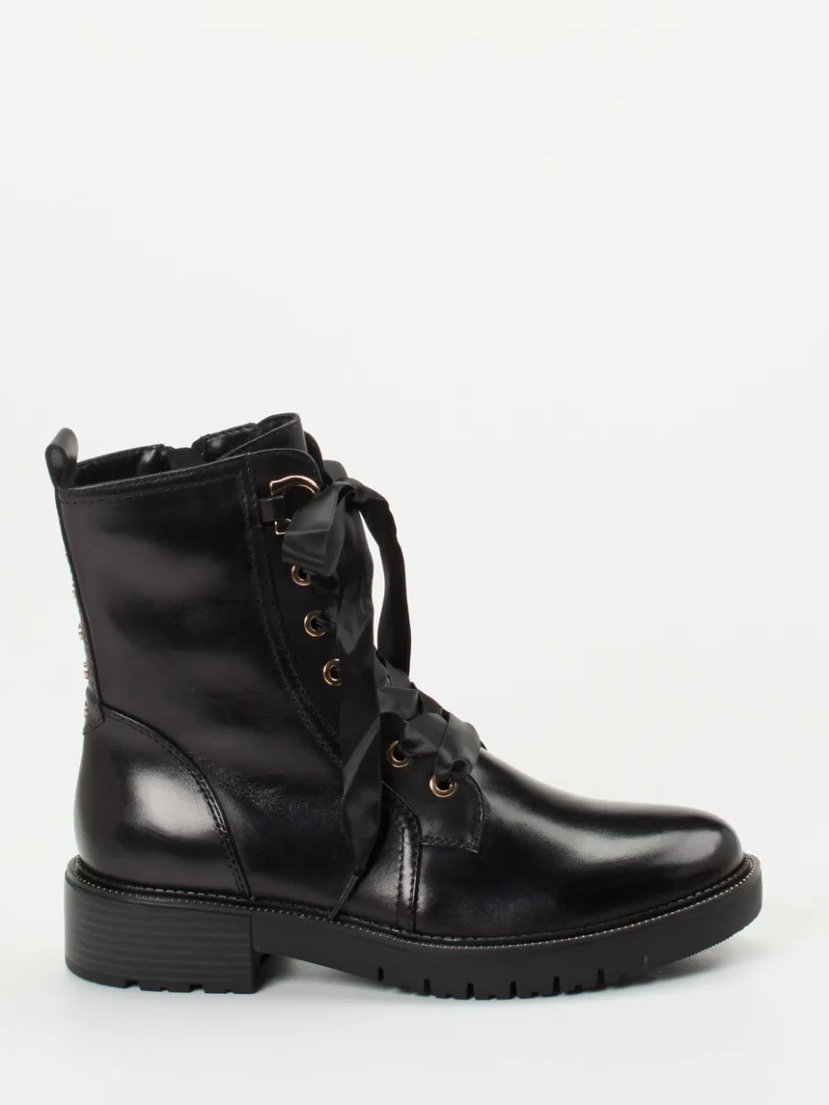 Stark im Stil: Schwarze Schnürboots im Premium-Look.Regarde Le Ciel interpretiert die klassische Damen-Schnürstiefelette neu. Diese glänzenden Schnürboots aus schwarzem Kalbleder verbinden robustes Streetwear-Flair mit femininem Twist. Die breiten Satinbänder kontrastieren elegant zu goldfarbenen Ösen und Ziernieten an der Ferse. Ein Reißverschluss an der Seite erleichtert das Anziehen, während das weiche Microfaserfutter angenehm wärmt. Die profilierte Gummisohle mit 3,5 cm Absatz und 2 cm Plateau sorgt für Stabilität – ideal für City-Touren oder Ausgeh-Abende. Kombinierbar mit Lederjacke oder Strickkleid für einen ausdrucksstarken Herbststil. Hochwertige Verarbeitung und trendbewusstes Design – typisch Regarde Le Ciel.