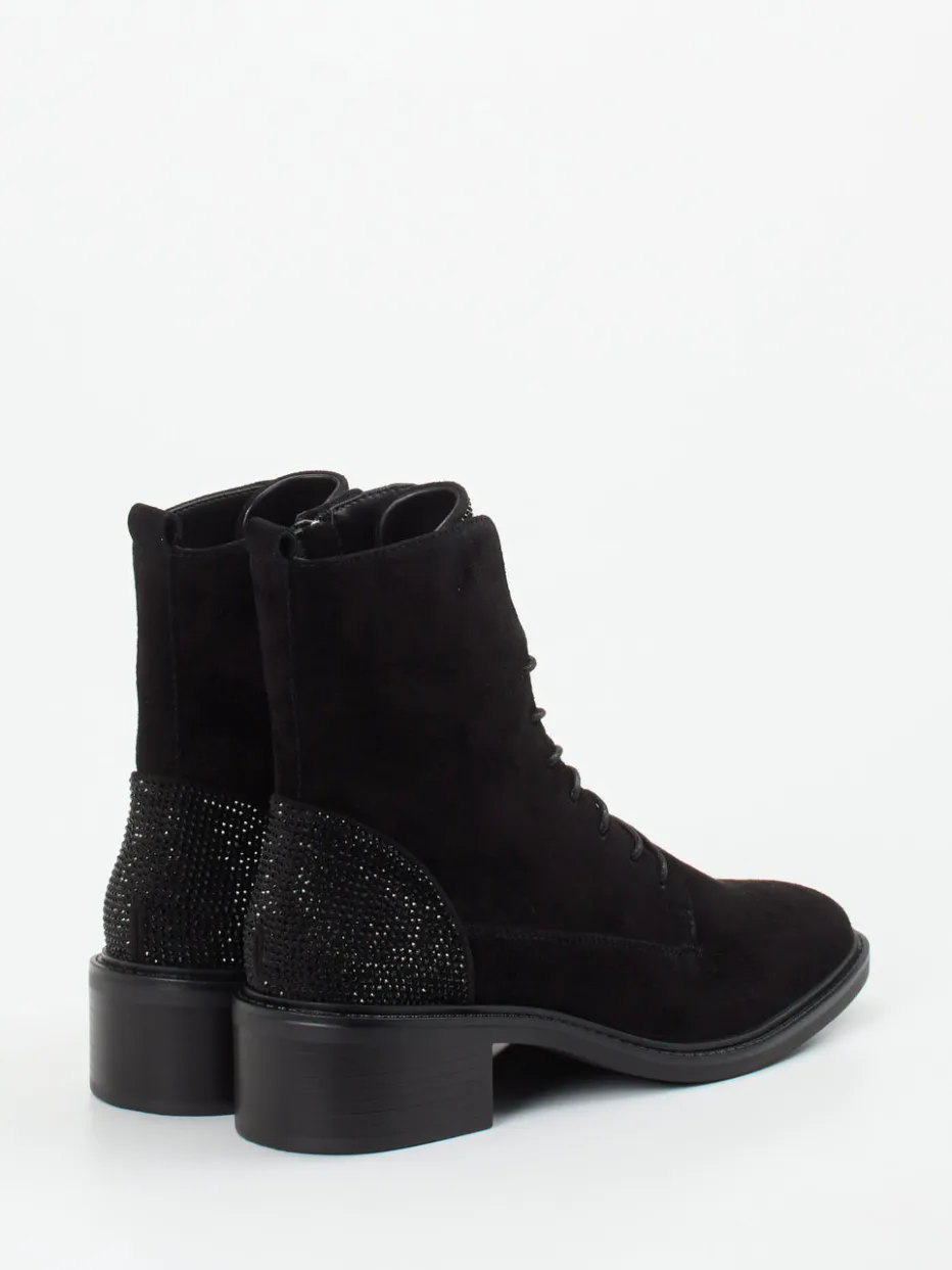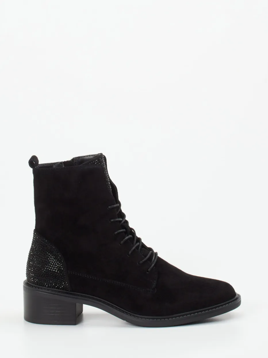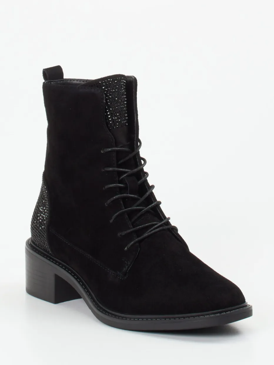 Die feminine Schnürstiefelette kombiniert softes Veloursleder mit dezenten Glitzerakzenten – ideal für stilbewusste Looks im Alltag oder am Abend.