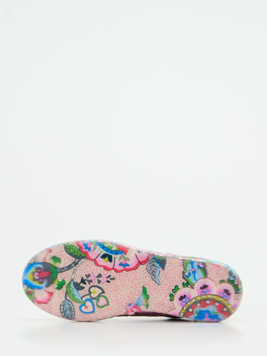 Die Marke Rise präsentiert einen Damen-Sneaker, der expressive Looks vollendet. Ideal für Freizeit oder stilvolle Abendanlässe kombiniert dieses Modell ein textiles Grundmaterial mit glänzender Oberfläche, roségoldenem Metallicleder und allover Strasssteinchen. Die dominante Rosé-Farbgebung wird durch florale Prints und himmelblaue Kontraste akzentuiert, die in einem klassischen, flach geschnittenen Low-Top-Design harmonieren. Eine transparente Gummisohle mit sichtbarem Blumenmuster unterstreicht den maximalistischen Trendansatz und sorgt für optische Tiefe. Weißes Kalblederfutter und ein gepolstertes Fußbett bieten Komfort. Ein Statement-Sneaker im Boho-Glam-Stil – trendorientiert und detailstark.