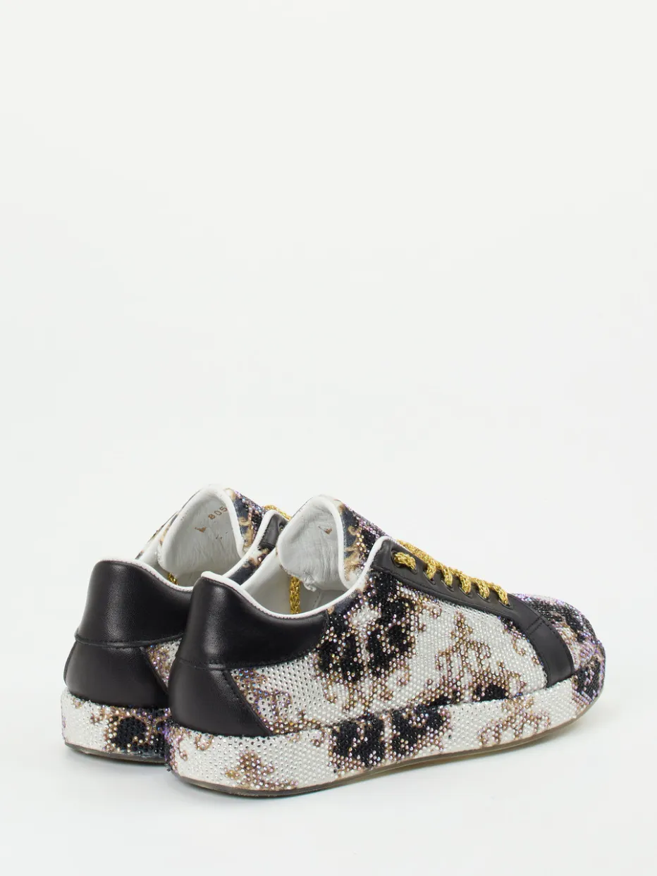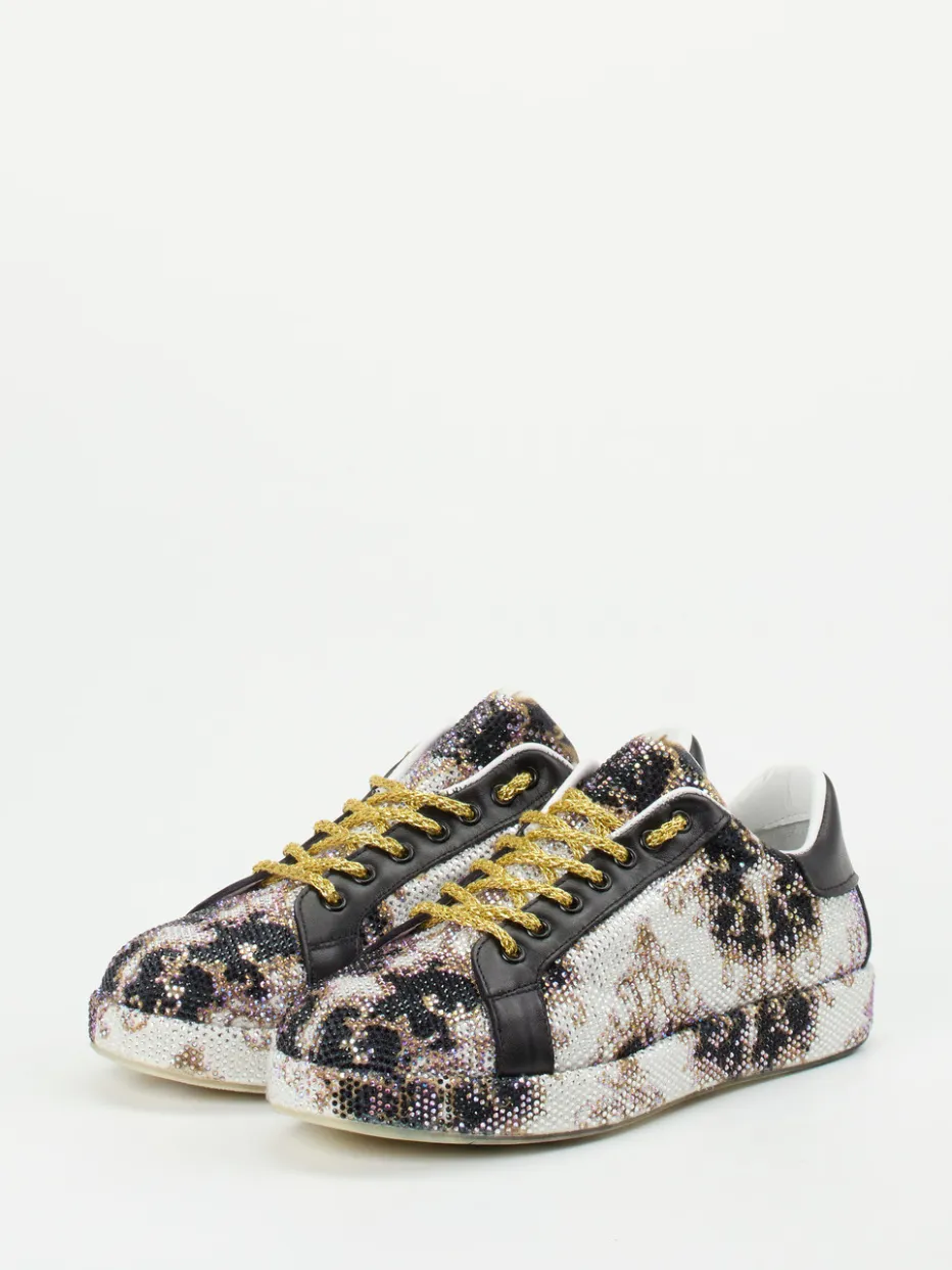 Funkelnder Statement-Sneaker mit barockem Twist.Die Marke Rise präsentiert mit diesem Sneaker ein expressives Modell für den Alltag und festliche Gelegenheiten. Die Kombination aus mehrfarbigem Metallicleder, samtigem Textil und üppigem Strassbesatz ist auffällig und luxuriös zugleich. Goldfarbene Schnürsenkel in Kettenoptik und ein barockes Sohlendekor unterstreichen das extravagante Design. Die rund geschnittene Low-Top-Silhouette mit gepolstertem Schaft bietet angenehme Trageeigenschaften, ergänzt durch ein weiches Kalblederfutter. Ideal für trendbewusste Looks mit maximalistischem Anspruch – zum Beispiel zu schmaler, schwarzer Denim und Gold-Accessoires. Stilsicherer Glanzpunkt mit modischer Strahlkraft von Rise.