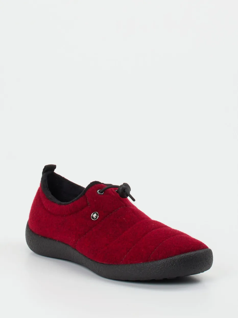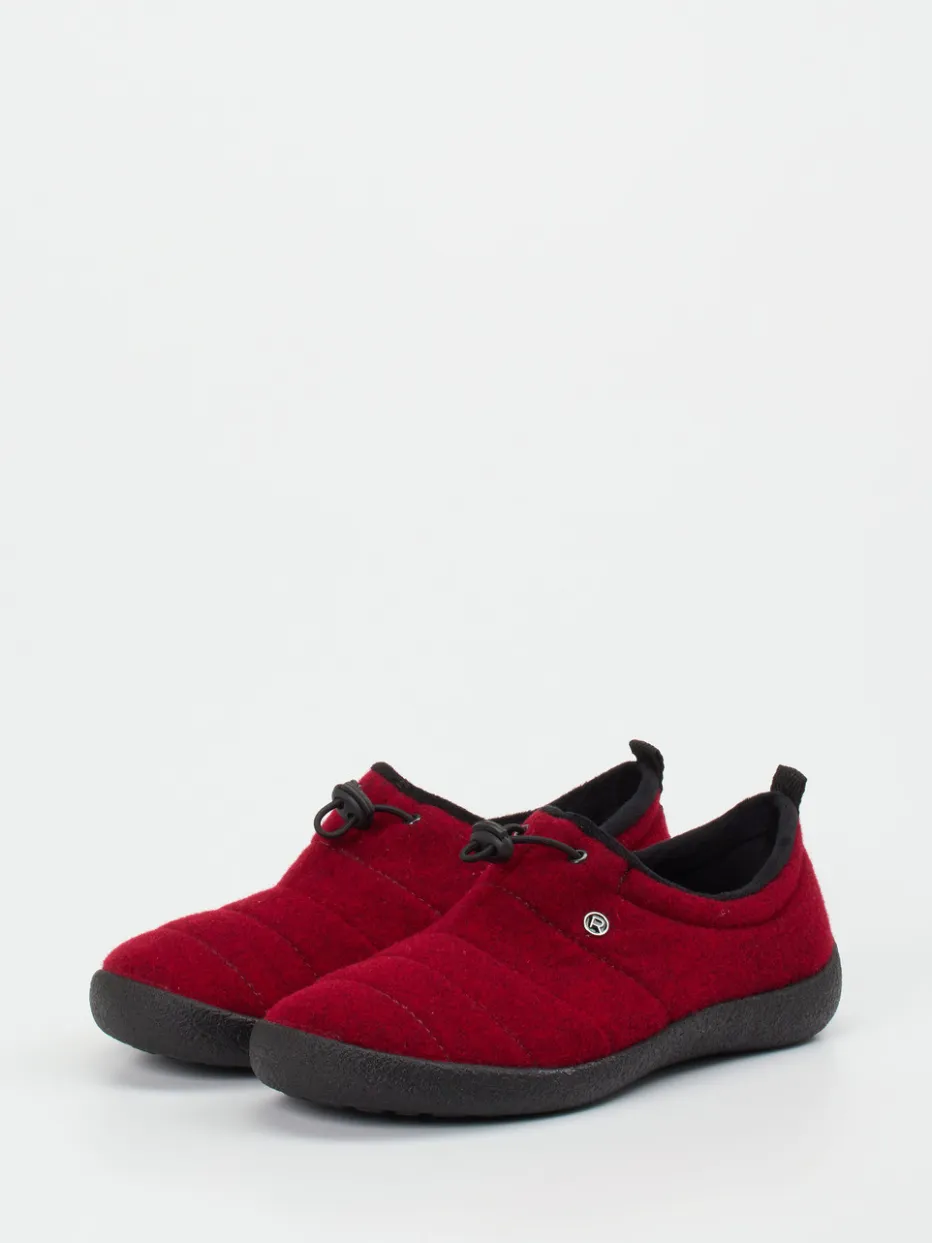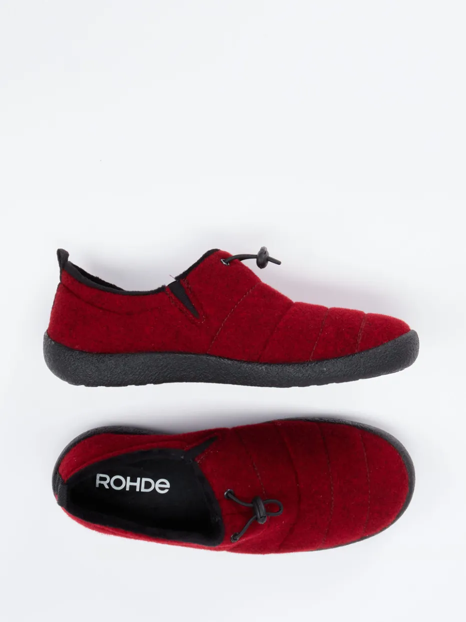 Wohlfühlkomfort für drinnen & draußen.Rohde präsentiert klassisch-moderne Hausschuhe in gefütterter Slipper-Form. Für entspannte Momente im Alltag oder kurze Wege zur Haustür bieten diese dunkelroten Filzmodelle angenehmen Wärmerückhalt und einen minimalistischen Look. Das samtig-weiche Obermaterial wird durch schwarze Kordelschnürung mit Stopper ergänzt, während die rutschhemmende Gummisohle sicheren Tritt verspricht. Die runde, flache Silhouette mit dezenten Ziernähten unterstreicht den lässigen Charakter – inspiriert von Outdoor-Designs, gemacht für Komfortliebhaber. Als Teil der Loungewear-Trends sind sie auch stilistisch am Puls der Zeit. Markentypische Qualität trifft auf modischen Funktionalismus.