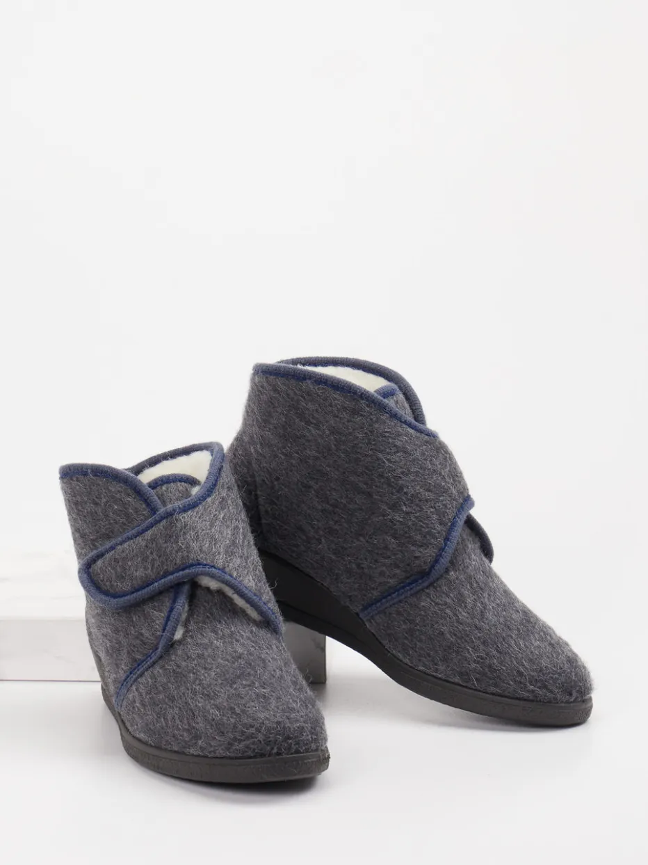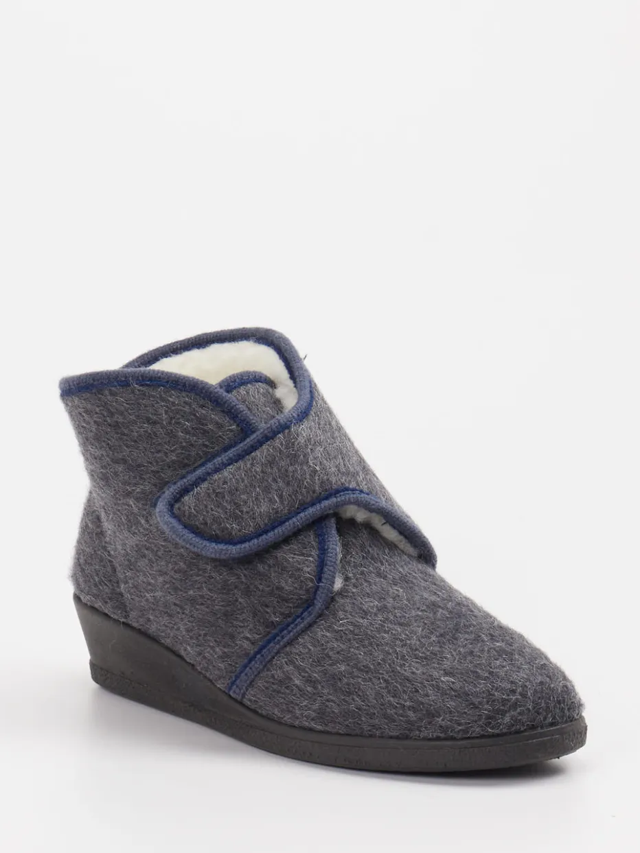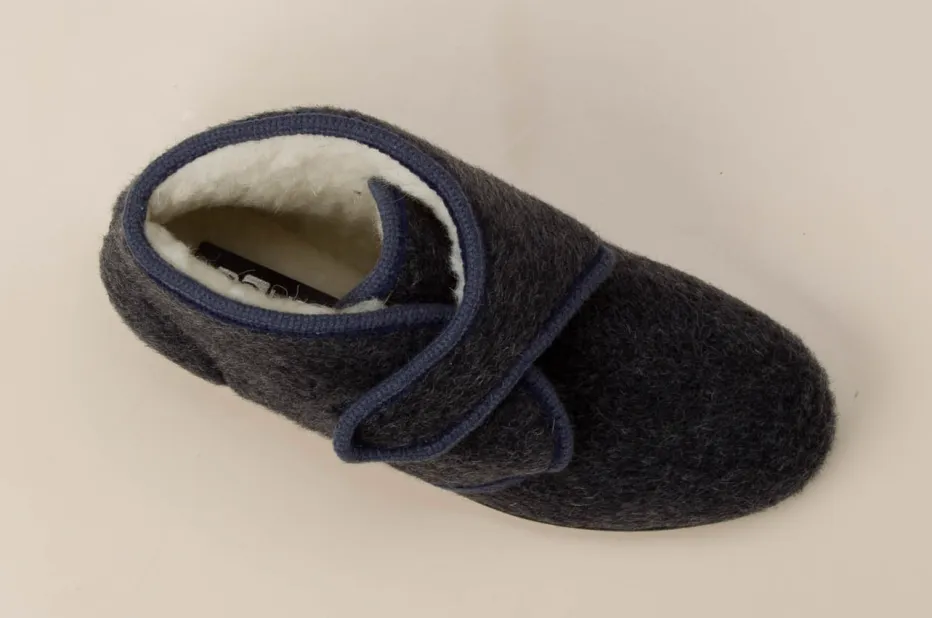 Wärme und Halt für ruhige Momente.Rohde zeigt mit dieser Damen-Hausstiefelette ein durch und durch komfortorientiertes Modell. Das Obermaterial besteht aus robustem Filz mit einer filzigen Oberfläche in edlem Anthrazitgrau, ergänzt durch eine dunkelblaue Kontrastpaspelierung. Innen wärmt ein flauschiges Futter aus dichter Schurwolle. Ein breiter Klettverschluss erleichtert den Einstieg, während die leichte Keilsohle aus rutschhemmendem Gummi sicheren Stand bietet. Die knöchelhohe Silhouette sorgt für angenehme Stabilität. Form und Finish greifen die Trends rund um „Quiet Luxury“ und „Cocooning“ stilvoll auf. Passt hervorragend zu weichen Loungewear-Looks. Ein wohldurchdachter Hausschuh mit funktionalem Komfort und reduzierter Ästhetik.