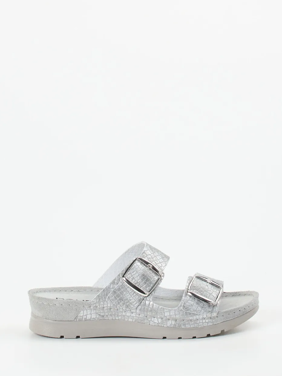 Diese Pantolette kombiniert silberfarbenes Echtleder in glänzender Krokoprägung mit ergonomischem Komfort – ideal für entspannte Sommertage mit Stilbewusstsein.
