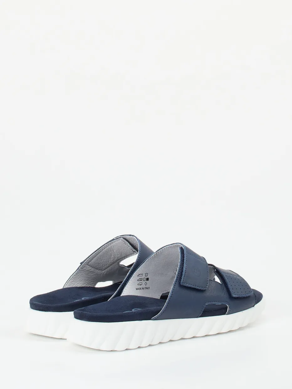 Sportiver Komfort für warme Tage.Die Marke Rohde präsentiert mit dieser Komfortpantolette ein lässiges Herrenmodell für Alltag, Freizeit und Zuhause. Die offene Konstruktion mit breiten, verstellbaren Klettverschlüssen sorgt für Flexibilität und Stabilität. Gefertigt aus samtig angeschliffenem Nubukleder in Marineblau, kombiniert mit weißem Innenfutter aus Leder, bietet sie eine stilvolle Komposition. Eine profilierte Gummisohle mit ergonomischer Form unterstützt bequemes Gehen – rutschhemmend dank Wellenprofil. Dezente Prägungen und Ton-in-Ton-Nähte unterstreichen den minimalistischen Look mit Streetwear-Einfluss. Harmoniert ideal mit leichten Stoffhosen und T-Shirts. Ein verlässlicher Begleiter mit markentypischem Komfortanspruch – alltagstauglich und trendgerecht.