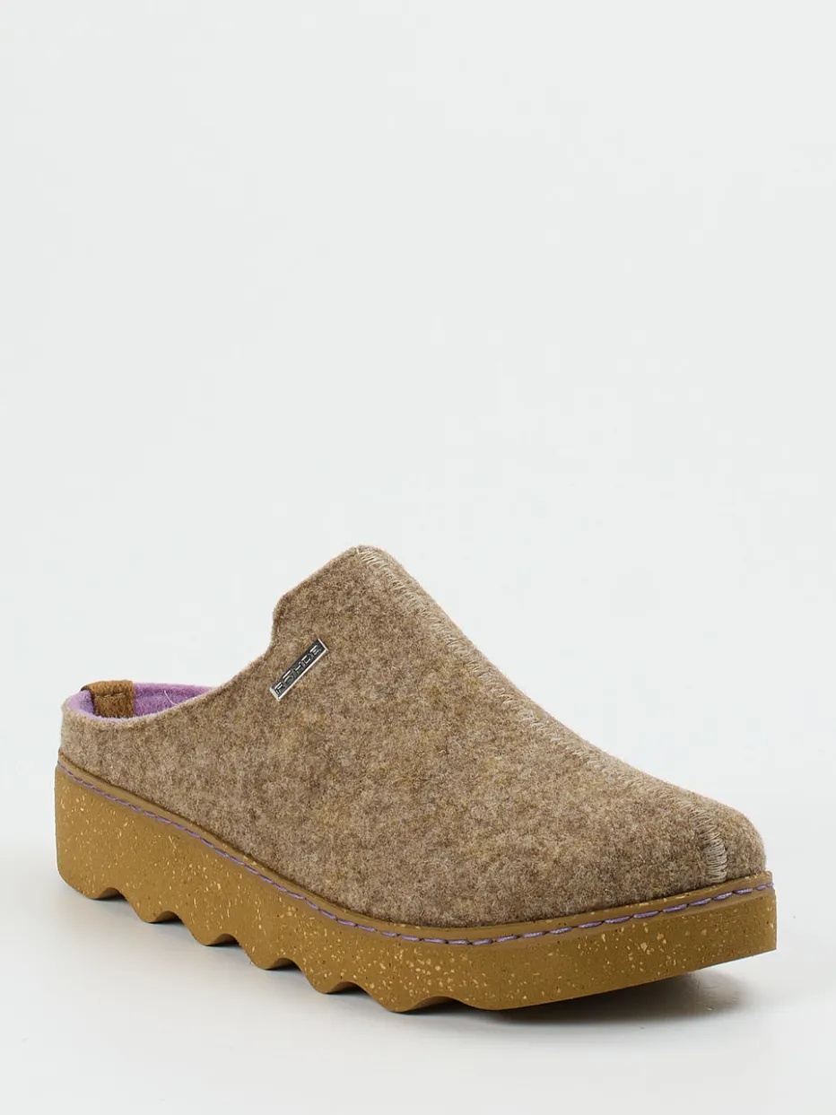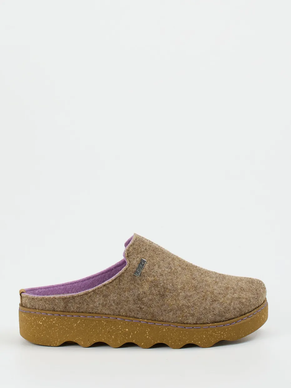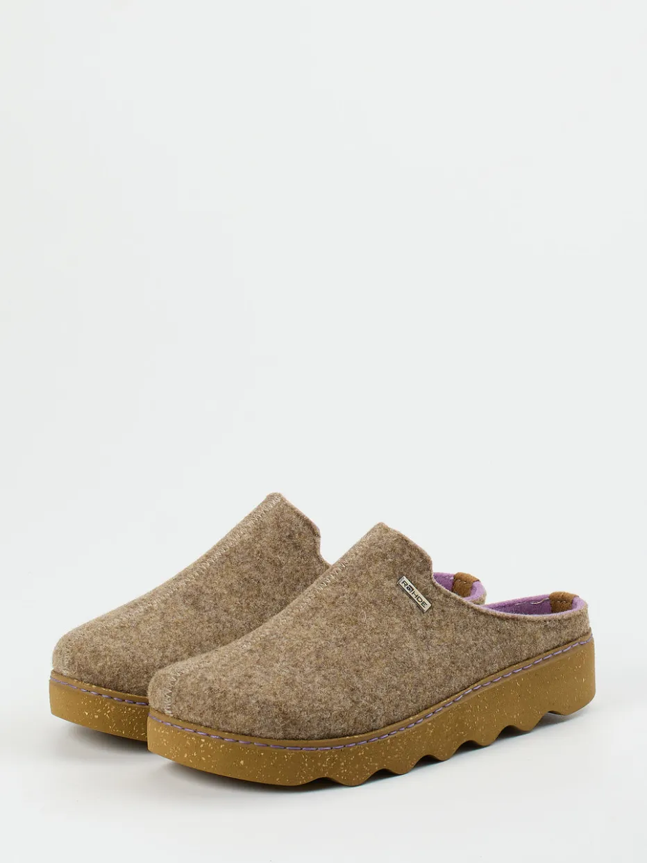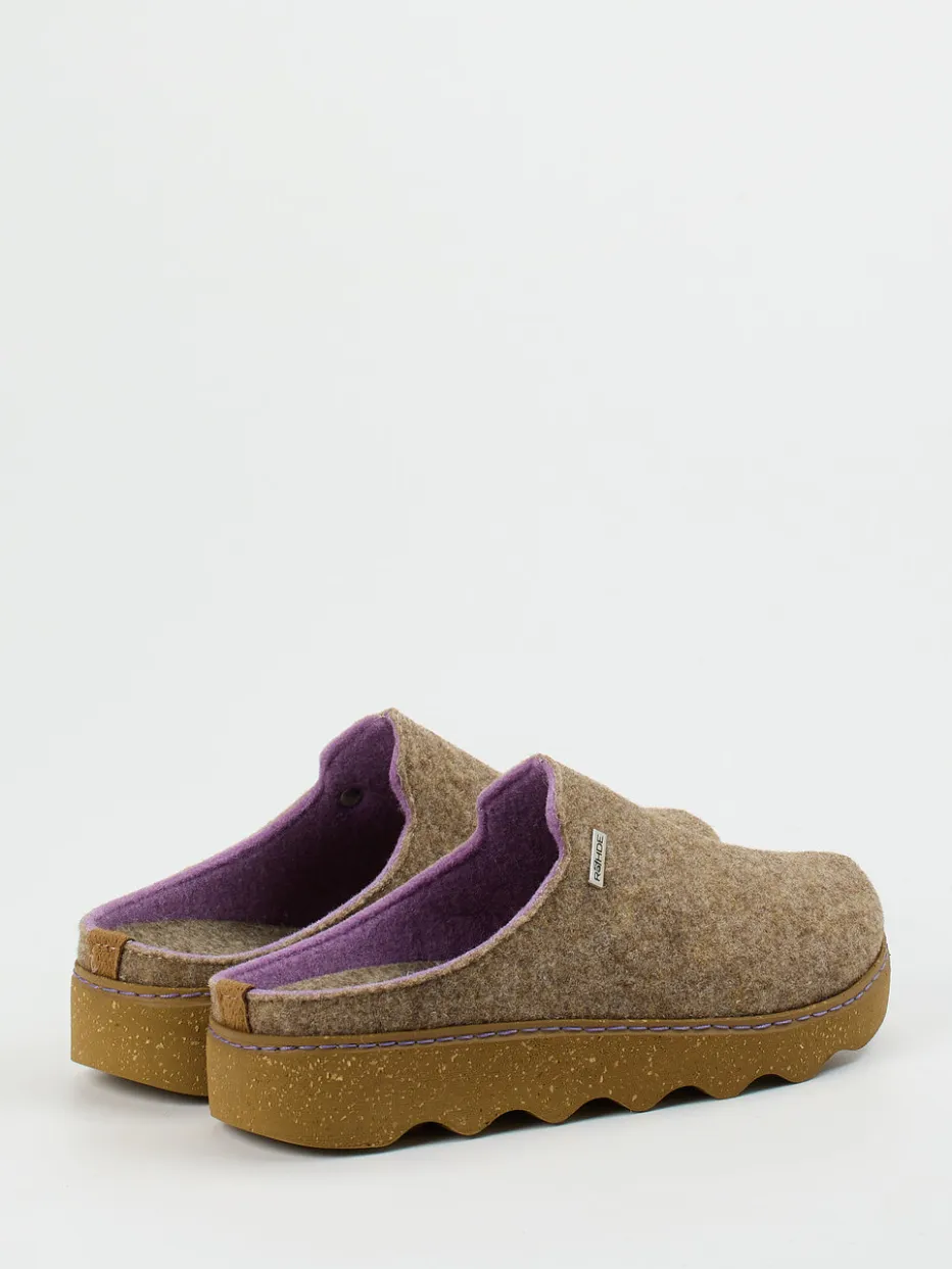 Gefertigt aus beigefarbenem Filz mit filzartiger Textur, überzeugen die Pantoffeln durch ein fliederfarbenes Textilfutter und eine ergonomisch geformte Sohle mit Wellenprofil. Die kontrastierende Naht und das dezente Markenbadge setzen stilvolle Akzente. Inspiriert vom Scandi-Minimalismus, passt das Modell zum aktuellen Quiet-Luxury-Trend und wirkt besonders harmonisch zu Loungewear oder Wollsocken.