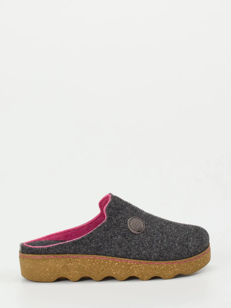 An kühlen Tagen schenkt der weiche, meliert strukturierte Filz in Anthrazit angenehme Wärme. Das auffallend pinke Innenfutter und die ergonomisch geformte Kunststoffsohle in Korkoptik bilden moderne Kontraste. Durch die offene Fersenpartie in bequemer Schlupfform bietet dieses Modell unkomplizierten Einstieg und hohen Tragekomfort. Geprägte Logos sowie pinkfarbene Kontrastnähte setzen dezente Marken-Highlights. Der Schuh fügt sich mühelos in den Trend „Quiet Luxury“ ein und passt ideal zu Fleece-Hausanzügen oder Kuschelsocken.